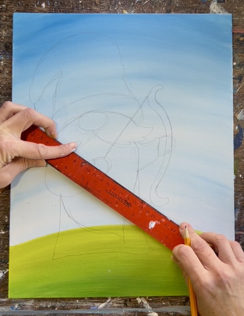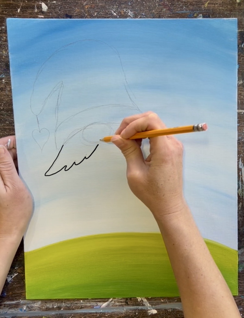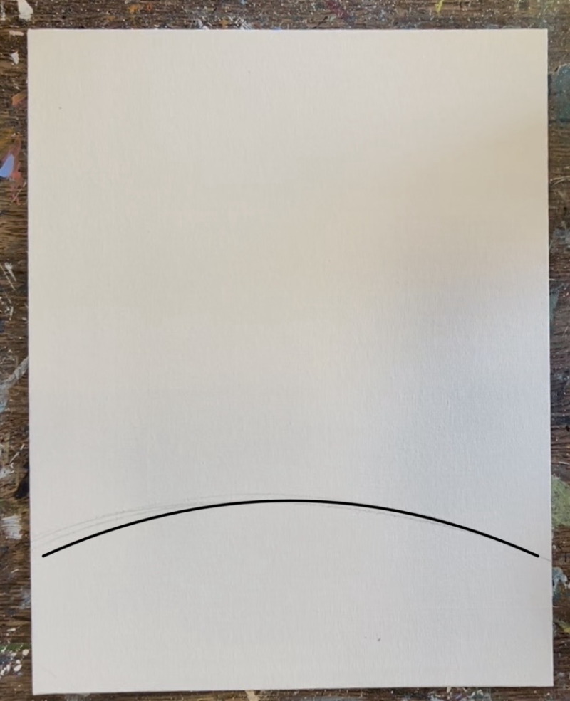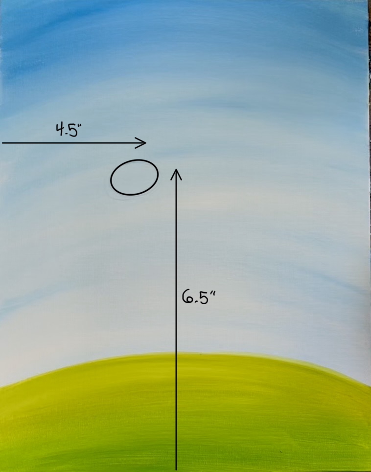 First use a pencil to lightly draw a hill line. I didn’t measure mine. Just estimate about 3-4″ from the bottom of the canvas and draw a slightly curved line.
