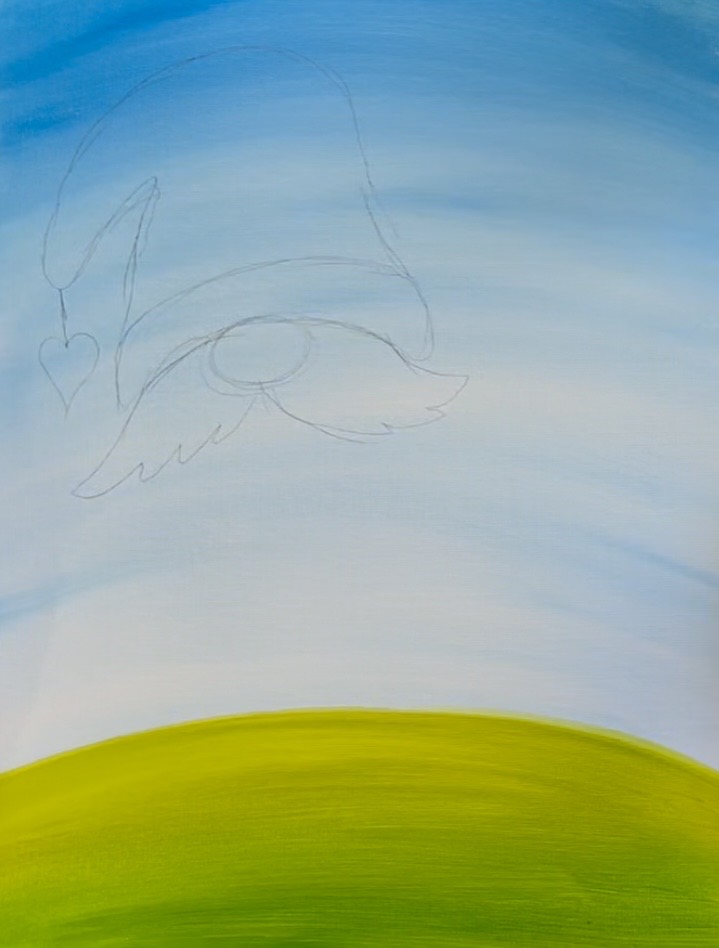 The wings are a little tricky but we can simplify them! I started with a medium blue layer. Mix “cerulean blue” with “titanium white”. You want a blue that is slightly darker than the sky so that it will stand out. You can even add just a dot of black into it to make it more of a gray-blue. Paint the shape of both of the wings. Do this very lightly. It doesn’t have to be a solid, thick coat of paint.