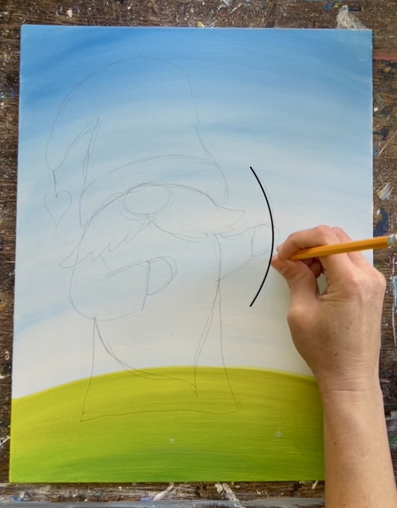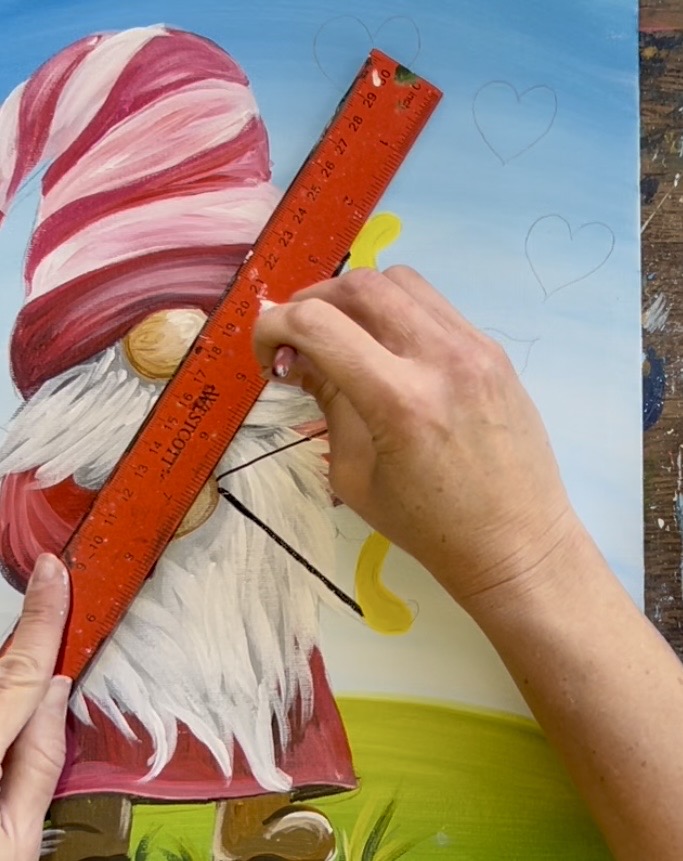 15. Use a ruler to draw the arrow. Mine ended up overlapping the gnome’s hand on the right but yours can go at a different angle if you prefer.