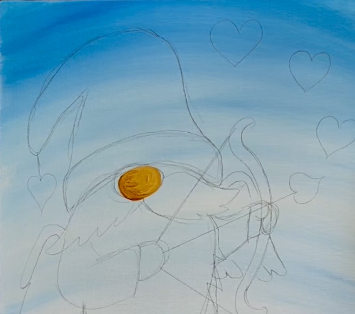 Use the #4 round brush to paint hearts in the background to fill up some of the blank spaces in the sky. You can do the hearts with any color. I used “cad red medium” mixed with “medium magenta”.