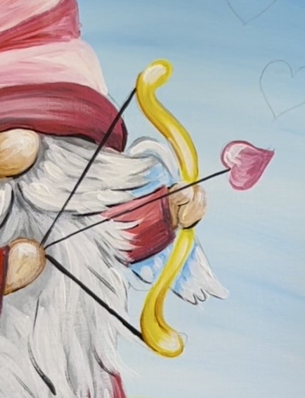 I recommend using a ruler to get the lines to be straight. Line the ruler up to where you want the line and use the #4 round brush and mars black to paint the line for the arrow as well as the string. Then paint a heart at the end of the arrow. I used “medium magenta” mixed with a little bit of red to make a medium pink color. Then lightly highlight one side of the heart with white.