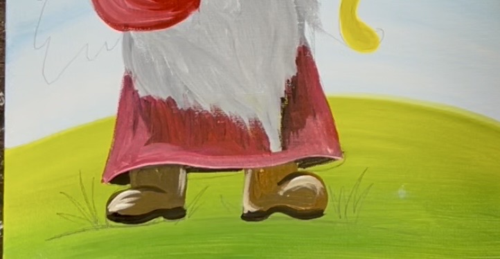 Use the color “cadmium red medium hue” to paint the sleeves on the gnome. You can also blend a little white into the red before it dries on the edges of the sleeves for a little bit of highlighting.