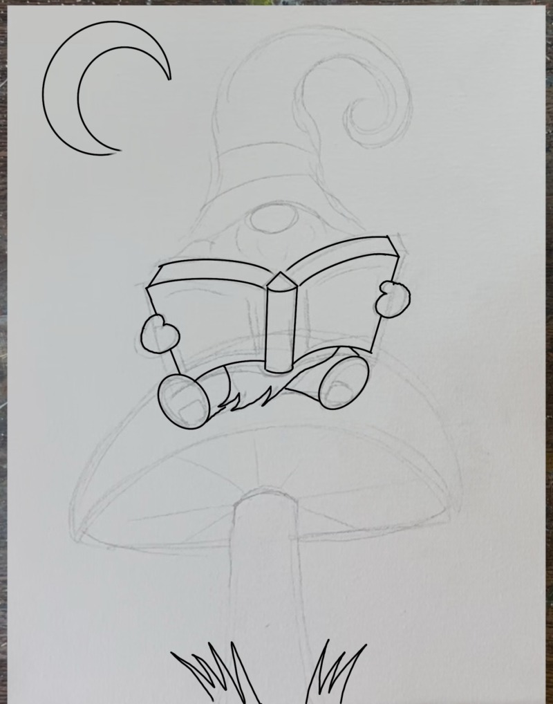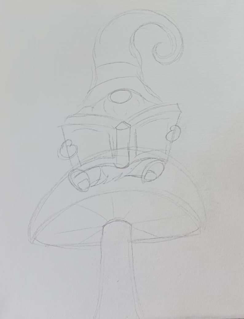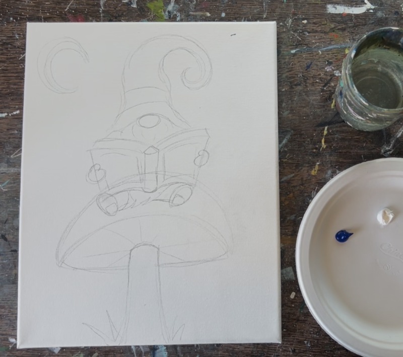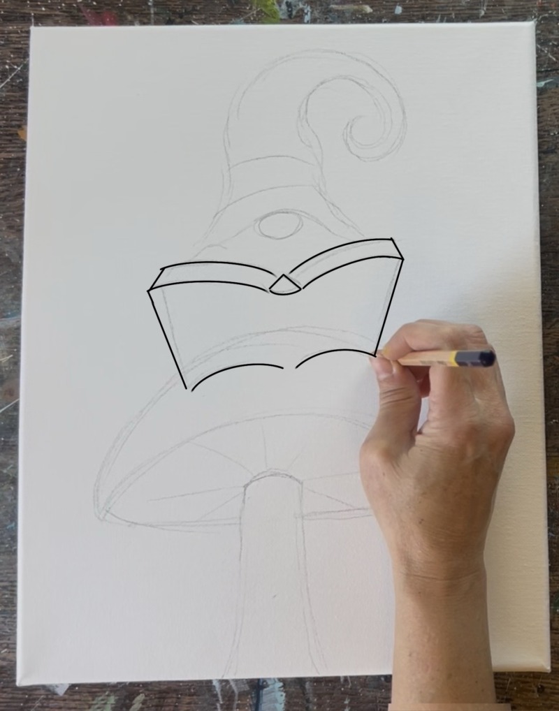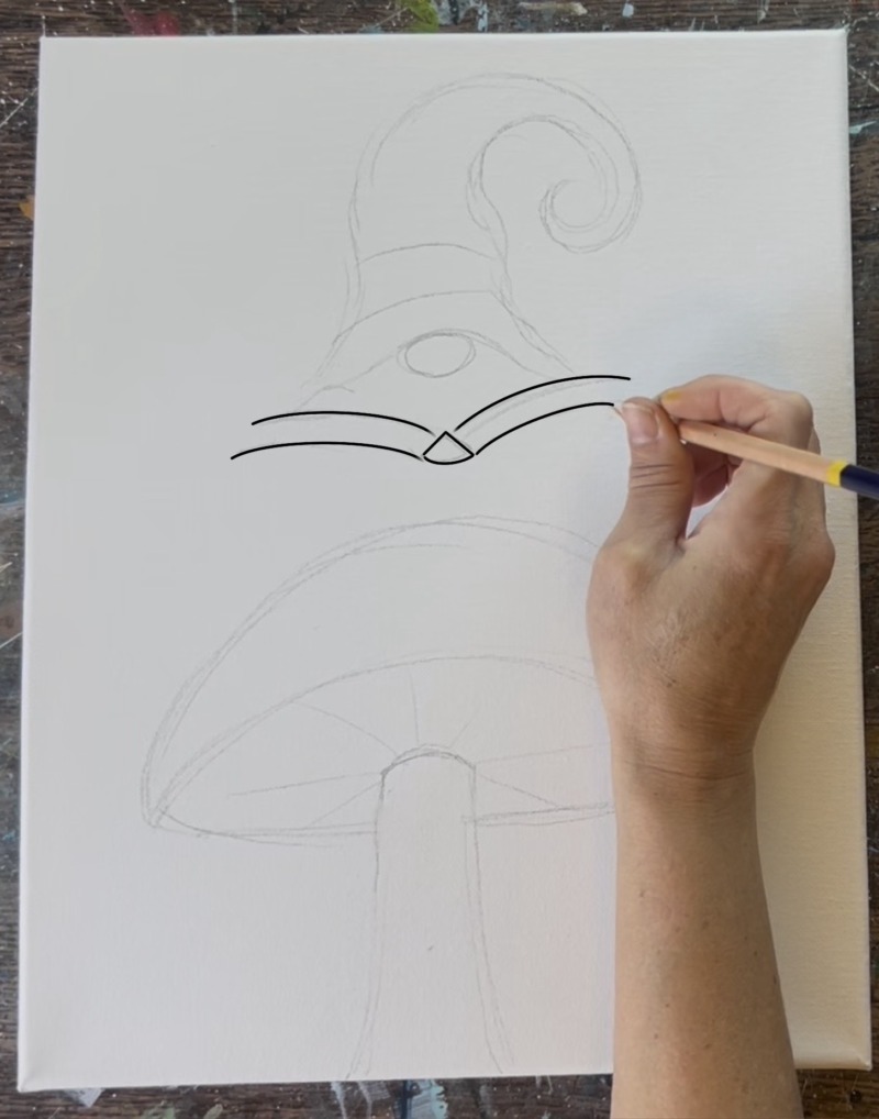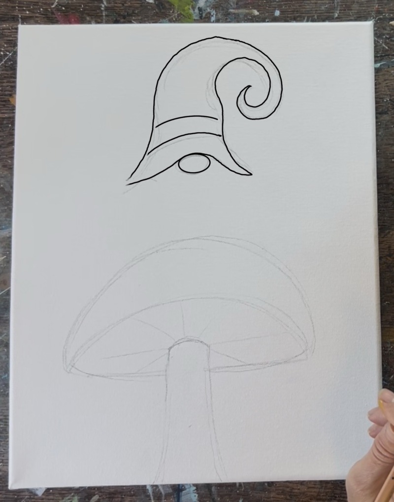 The bottom half of the canvas consists of the very large mushroom that the gnome will be sitting on. Start by drawing a large and wide crescent shape (for the top of the mushroom. Then draw a stem extending from under the crescent shape. These are two lines that go wider closer to the bottom edge of the canvas. The top of this shape is a small arc line. This entire mushroom is about 7″ high (working on an 11×14 canvas).