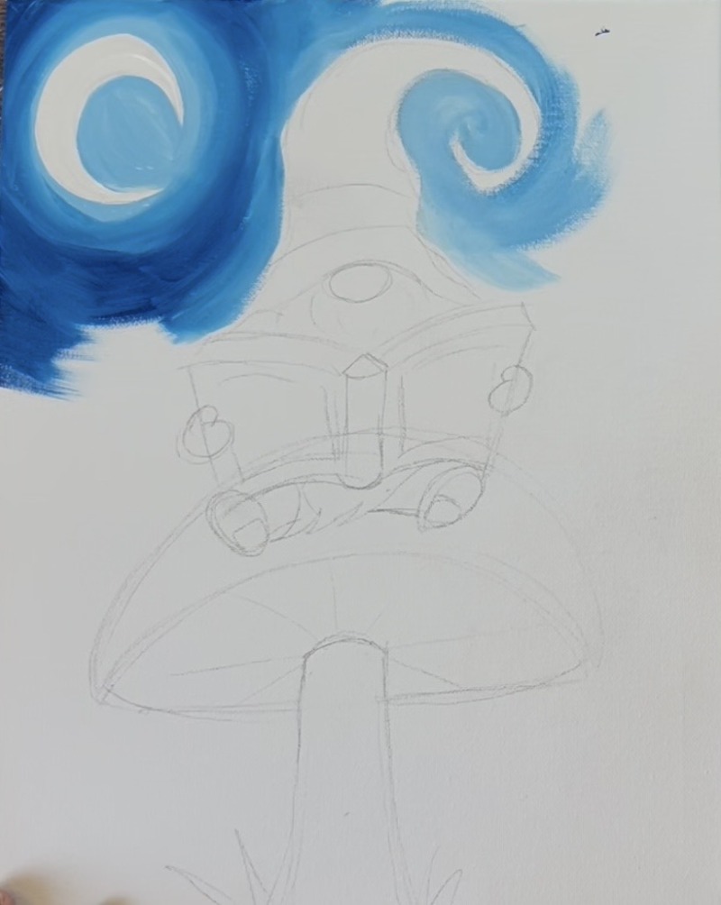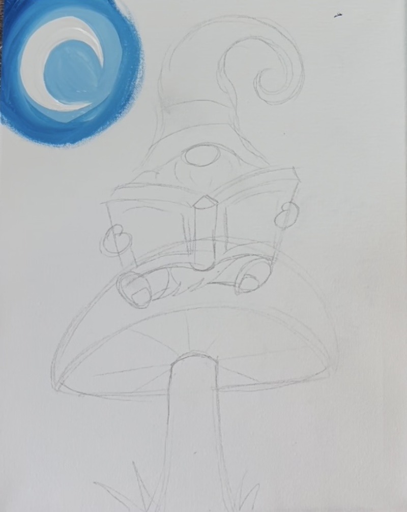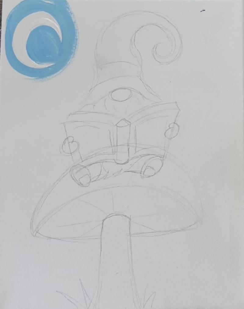Use this light blue color all around the gnome and mushroom. Get as close as possible to your drawing without leaving any gaps. It’s okay to paint over some of your lines.