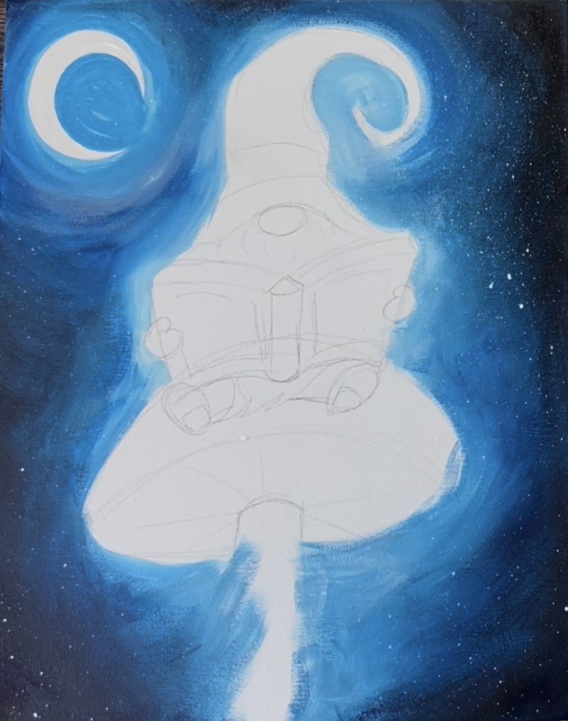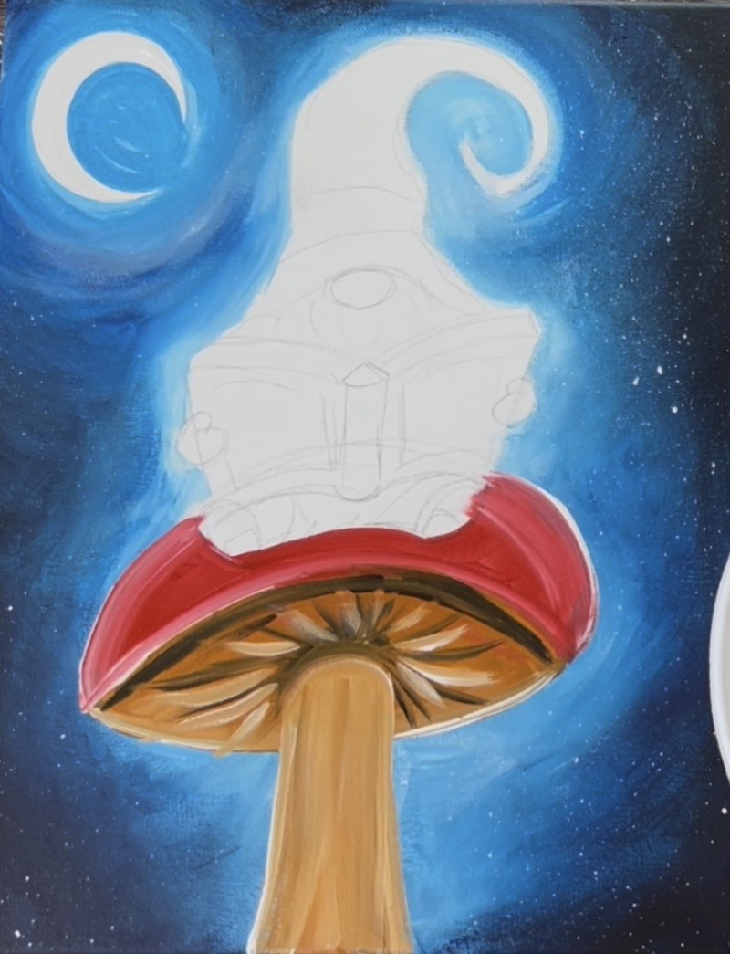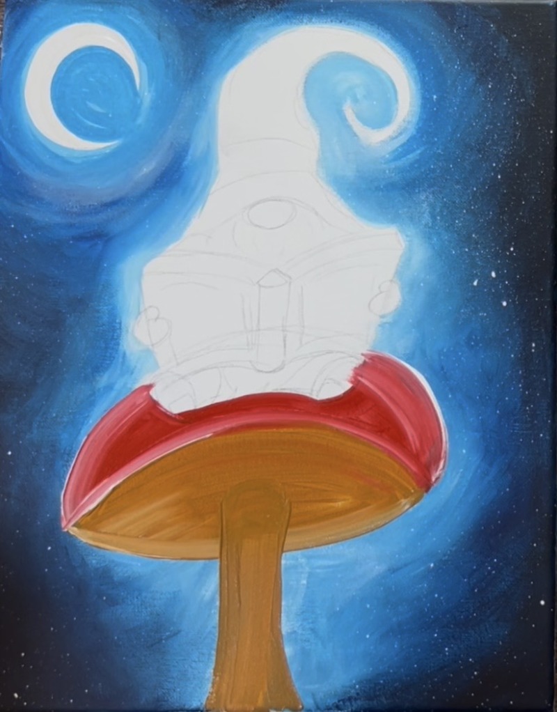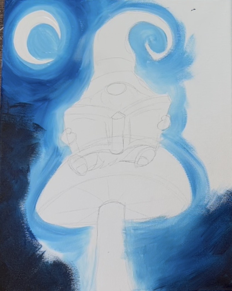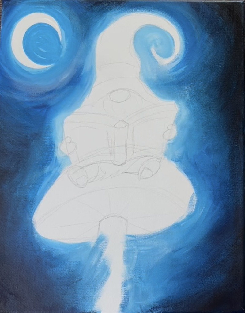 Next, we will paint the light blue “glow” that is surrounding the gnome. To do this, use the same color as you used for around the moon (that light blue color). Paint light blue all around the gnome. Your paint strokes will curve around the shape of the gnome’s hat, book, mushroom, etc. Use a round brush to get into some of the tighter places.