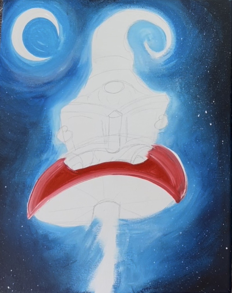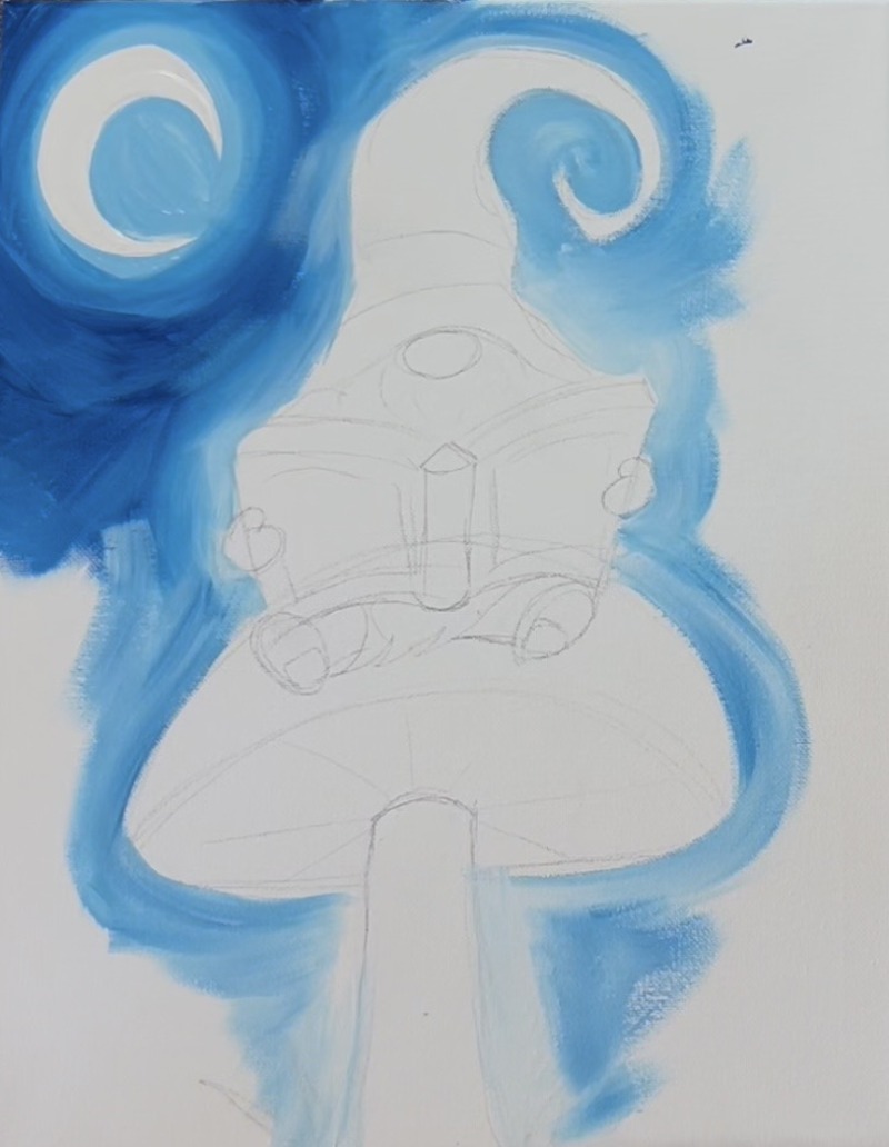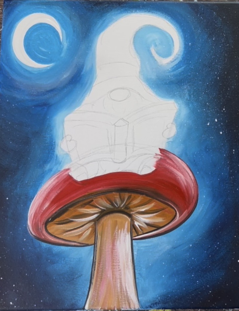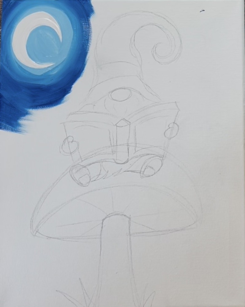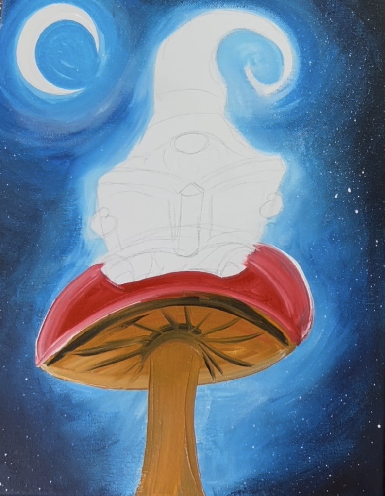 Next, we will paint the light blue “glow” that is surrounding the gnome. To do this, use the same color as you used for around the moon (that light blue color). Paint light blue all around the gnome. Your paint strokes will curve around the shape of the gnome’s hat, book, mushroom, etc. Use a round brush to get into some of the tighter places.
