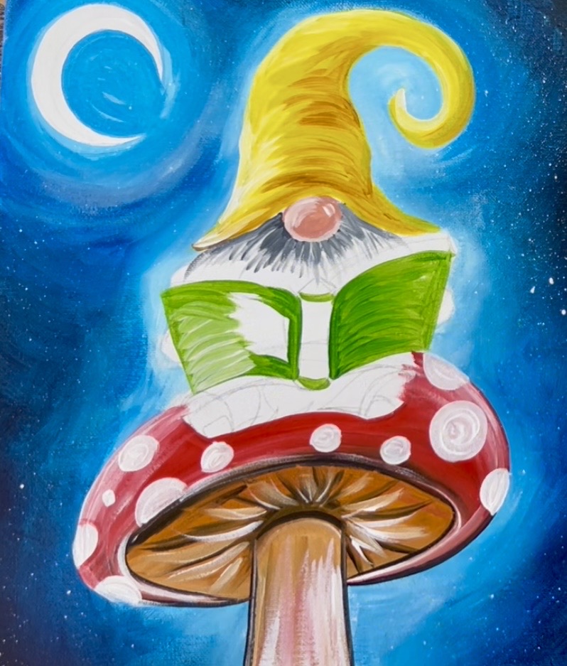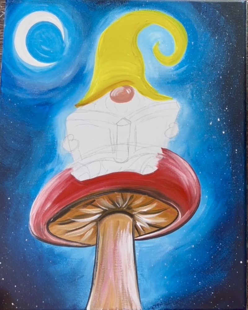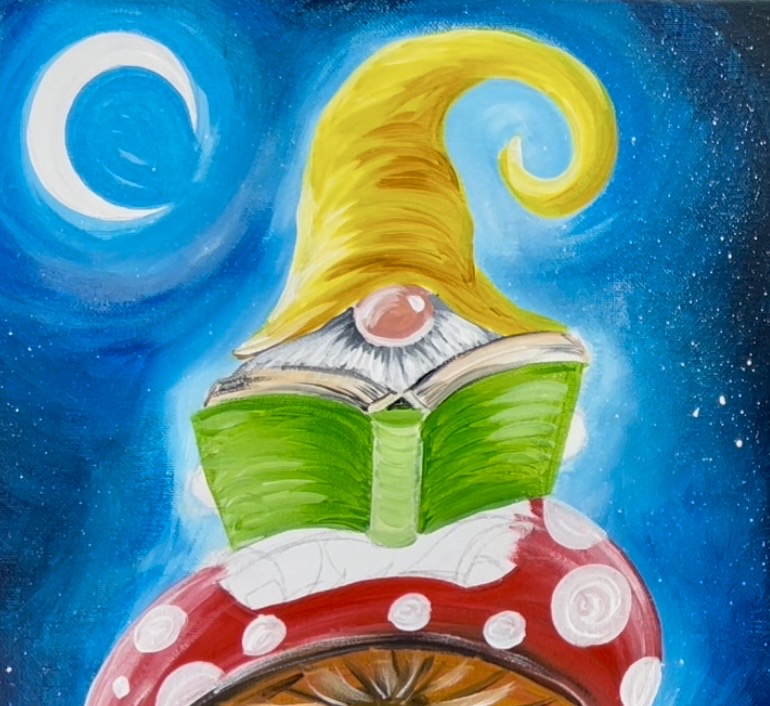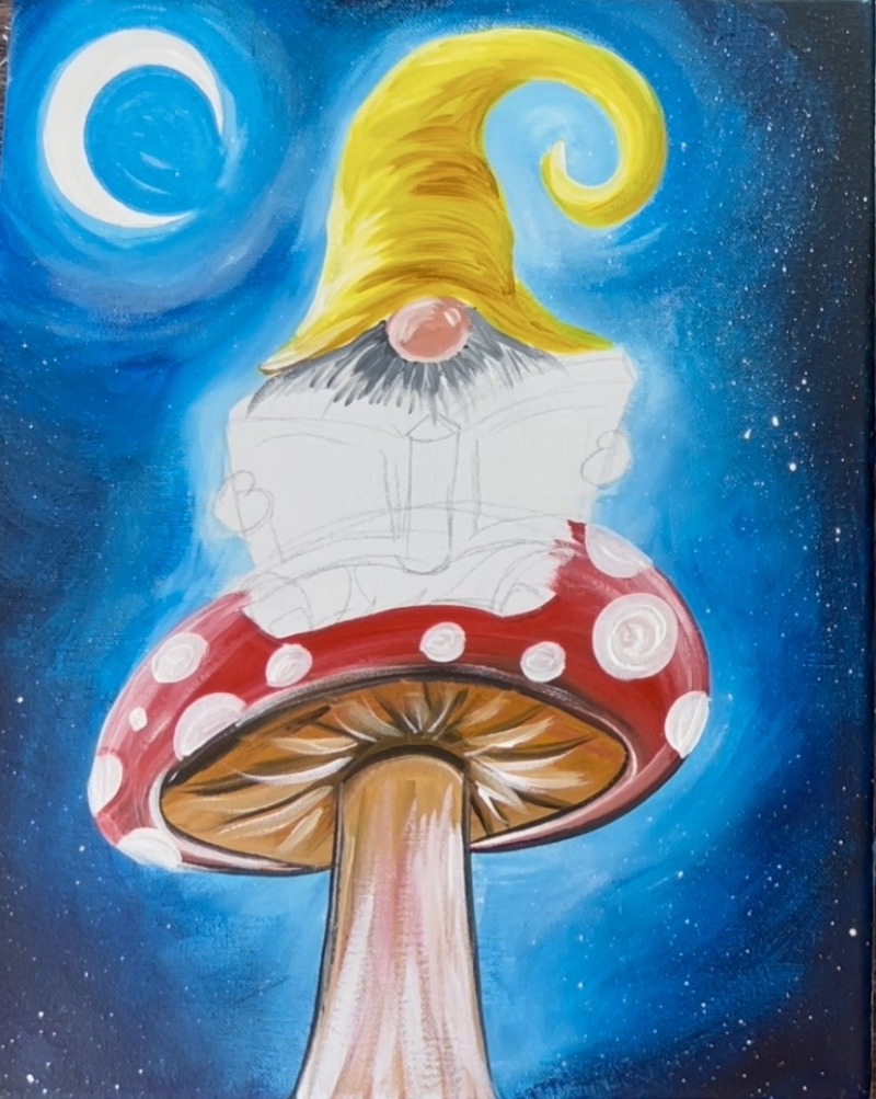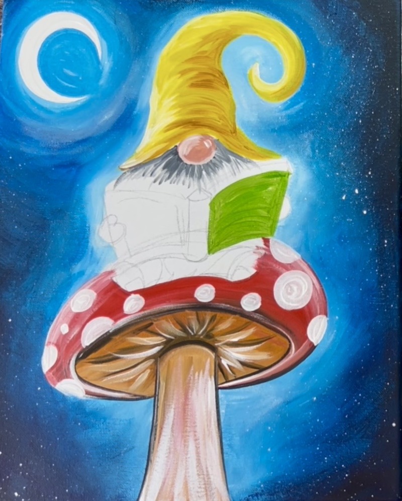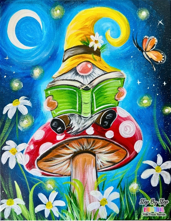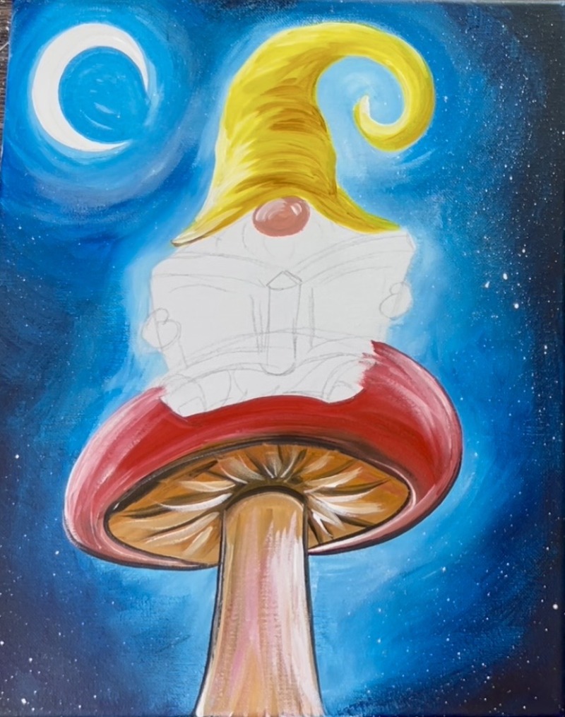 Learn how to paint a magical, whimsical scene of a gnome sitting on a mushroom and reading a book! My favorite part of this painting is that “glow” in the background around the gnome, mushroom and moon! This is a great background painting technique that provides amazing contrast to the main subject of the painting. It works especially well for dark, night sky backgrounds. Basically, you blend a much lighter color around the subject and allow the edges of the canvas to remain darker.