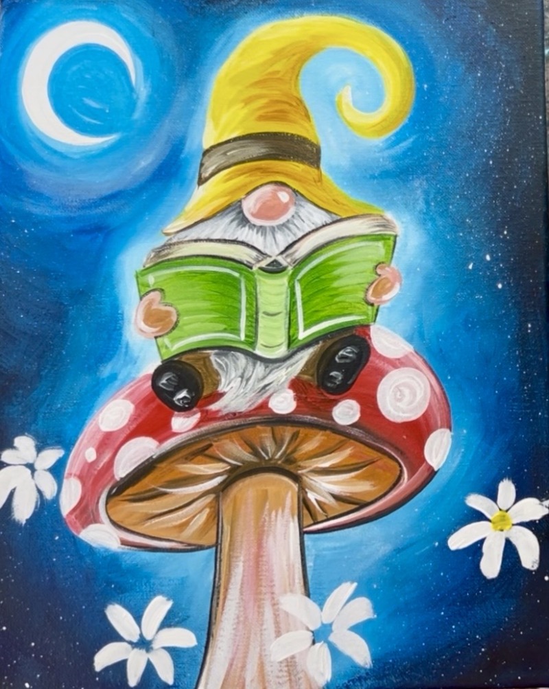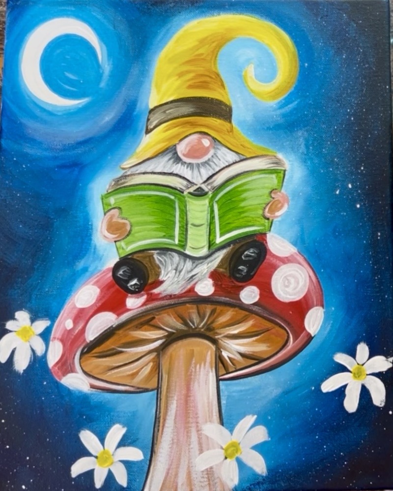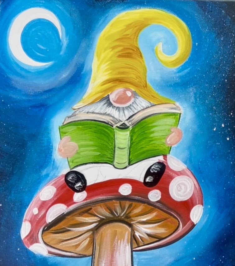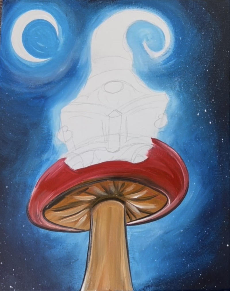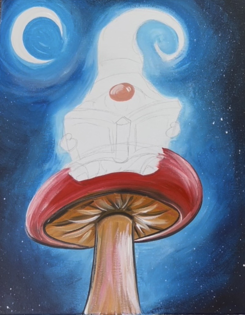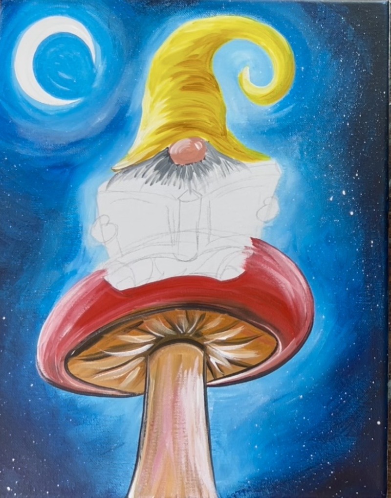 Learn how to paint a magical, whimsical scene of a gnome sitting on a mushroom and reading a book! My favorite part of this painting is that “glow” in the background around the gnome, mushroom and moon! This is a great background painting technique that provides amazing contrast to the main subject of the painting. It works especially well for dark, night sky backgrounds. Basically, you blend a much lighter color around the subject and allow the edges of the canvas to remain darker.