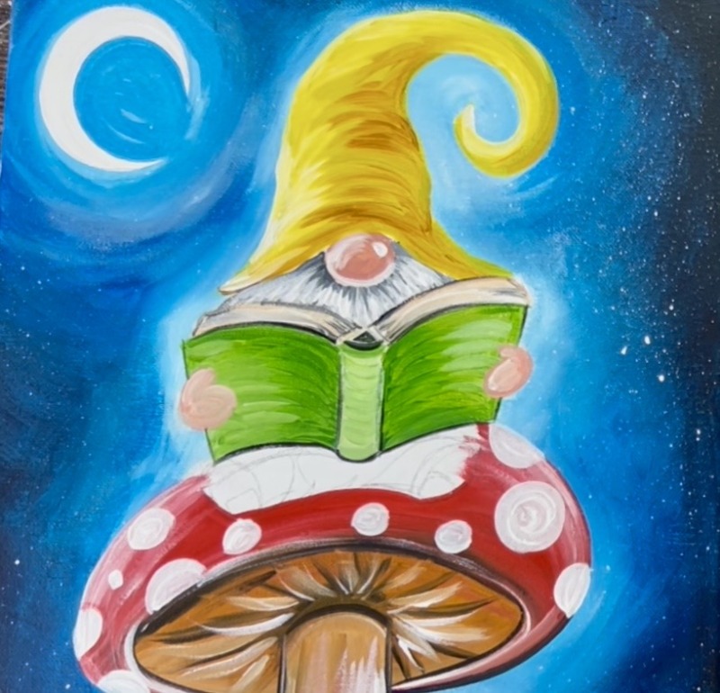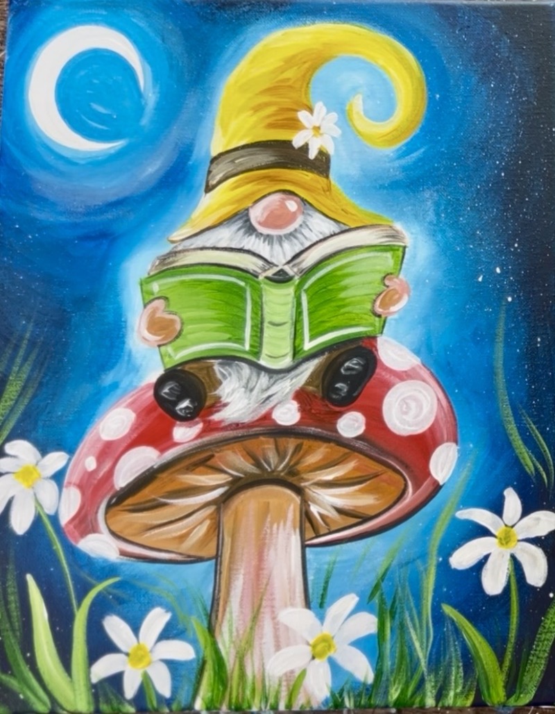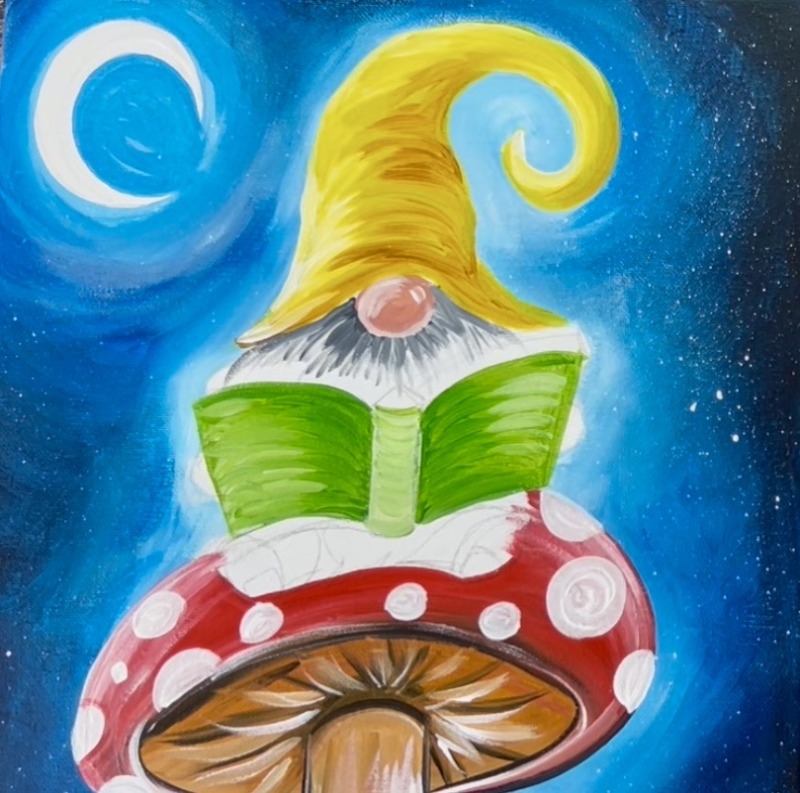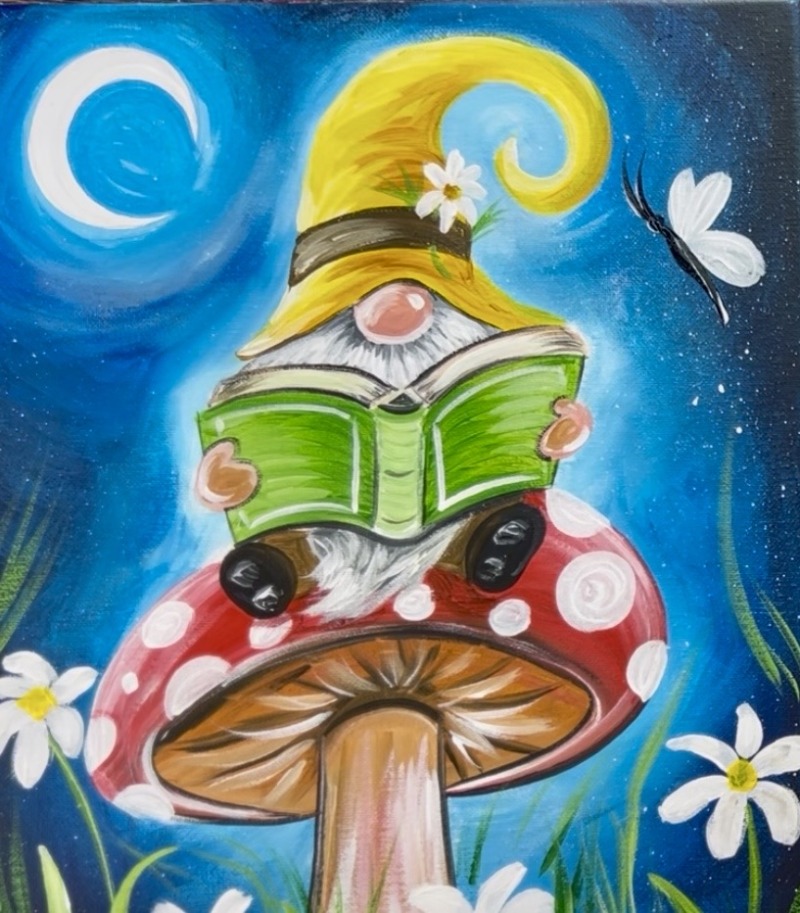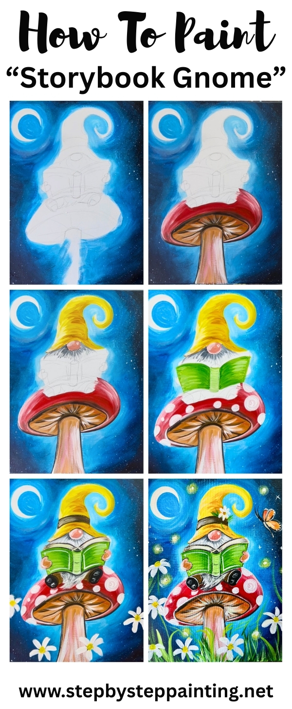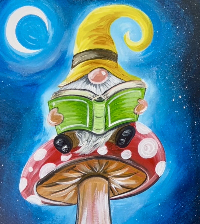 Learn how to paint a magical, whimsical scene of a gnome sitting on a mushroom and reading a book! My favorite part of this painting is that “glow” in the background around the gnome, mushroom and moon! This is a great background painting technique that provides amazing contrast to the main subject of the painting. It works especially well for dark, night sky backgrounds. Basically, you blend a much lighter color around the subject and allow the edges of the canvas to remain darker.