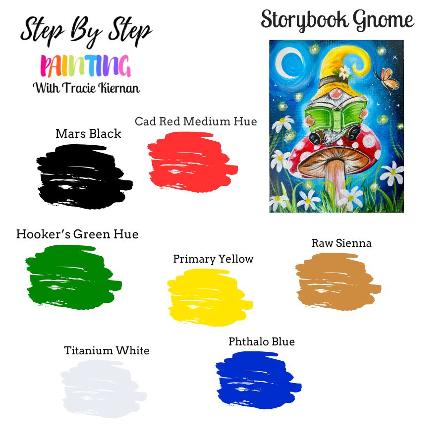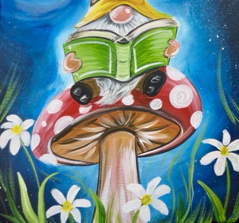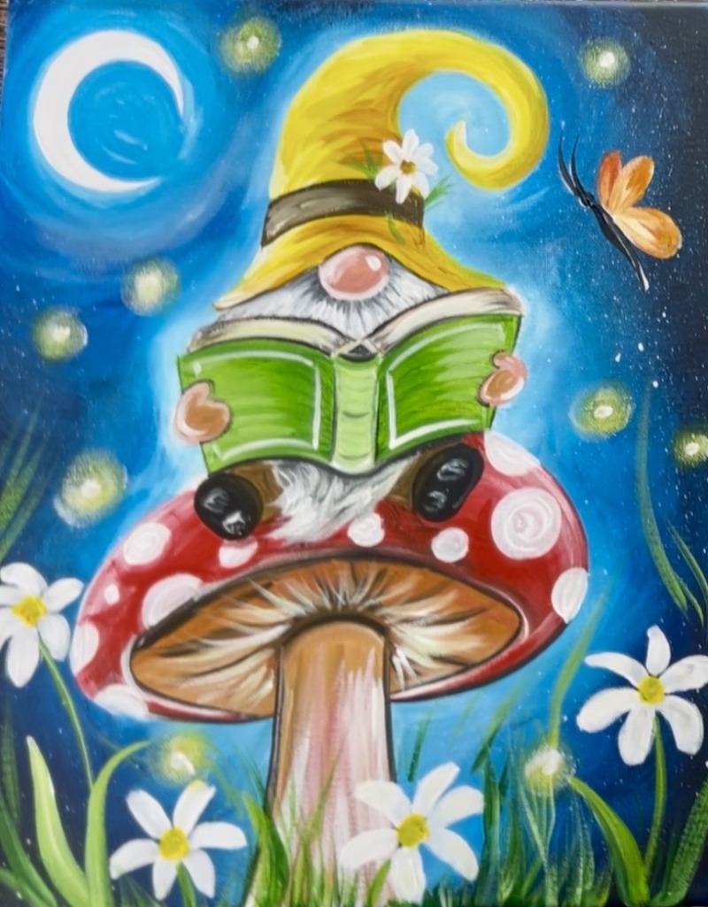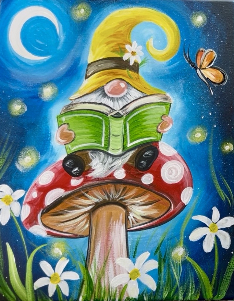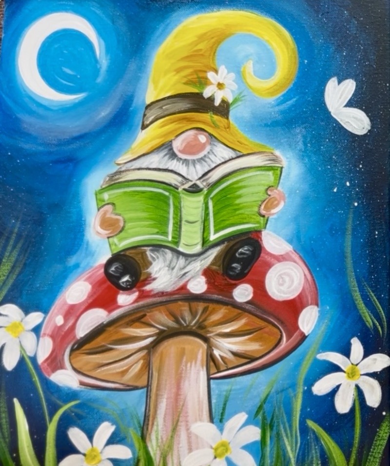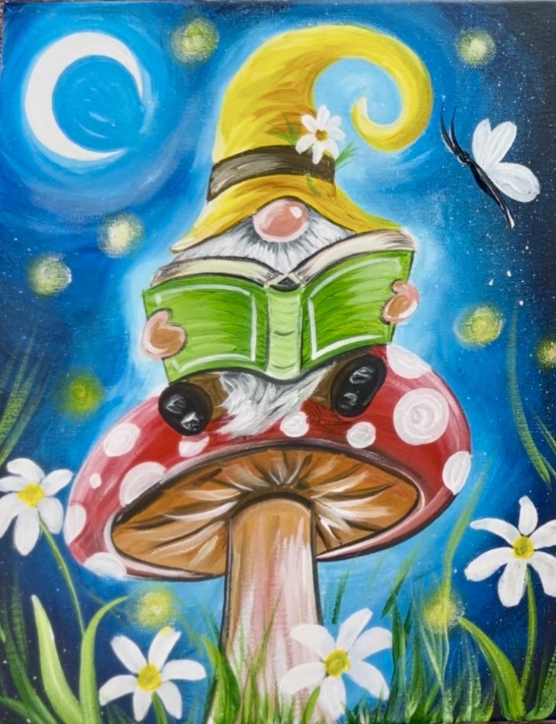 Learn how to paint a magical, whimsical scene of a gnome sitting on a mushroom and reading a book! My favorite part of this painting is that “glow” in the background around the gnome, mushroom and moon! This is a great background painting technique that provides amazing contrast to the main subject of the painting. It works especially well for dark, night sky backgrounds. Basically, you blend a much lighter color around the subject and allow the edges of the canvas to remain darker.