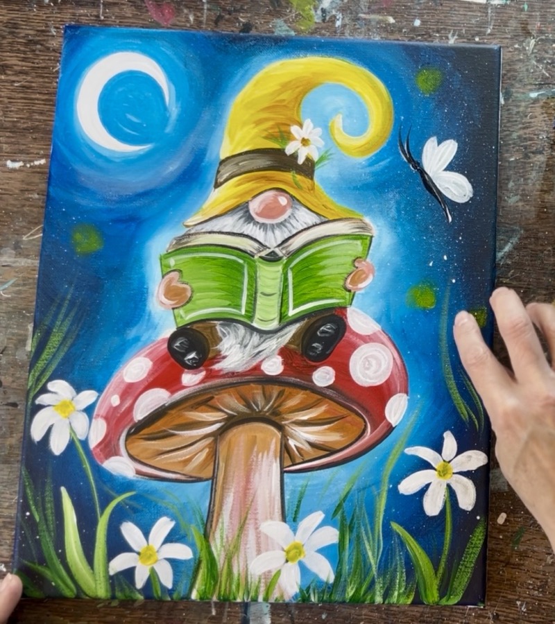 Some final details in this painting includes: painting twinkling stars in the sky, adding white dots on the butterfly wing birder, adding more grass and/or more daisies and adding some grass/ stem in the gnome’s hat under the belt.