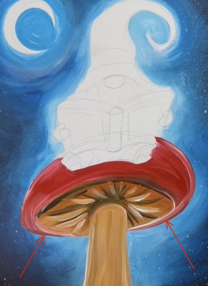 Next, use the round brush or #12 bright brush to paint the red top of the mushroom so that it wraps under and around the stem (as shown in picture below). It goes narrow and disappears but we can still see some red!