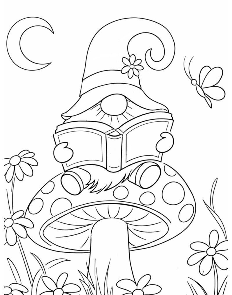 The nose is about 2″ above the top edge of the mushroom top. Draw a small oval shape (about 1″ wide). Then draw the hat. Start by drawing a line that curves up and above the gnome’s nose. Then draw the hat so that it curves to the left and then spirals to a point on the right.