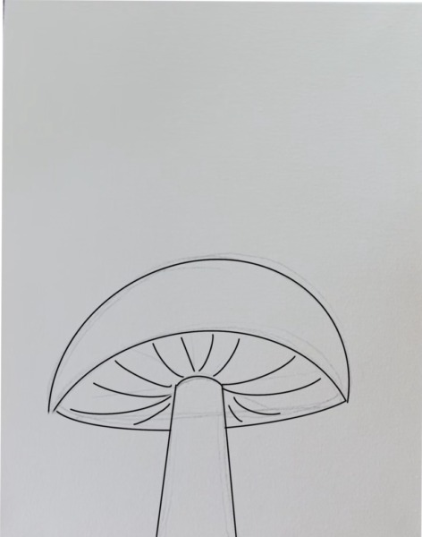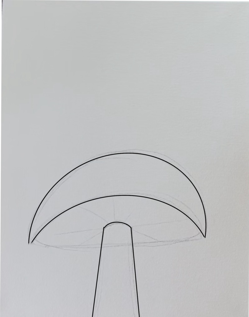 Then draw a curve line that extends behind the stem and connects to the points of the “crescent shape”. Draw “gills” under the mushroom by drawing several curved lines that extend from the top of the stem to the outer parts of the mushroom top.