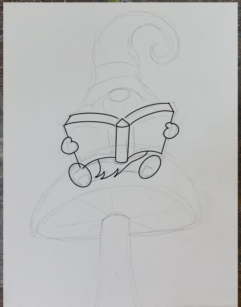 Draw the “spine” of the book by drawing a set of vertical lines. The bottom of this “spine” is a small curved line. Then draw a set of ovals for the gnome’s shoes and hands that overlap the sides of the book. Also, draw little curved/pointed lines to create the edge of the beard.