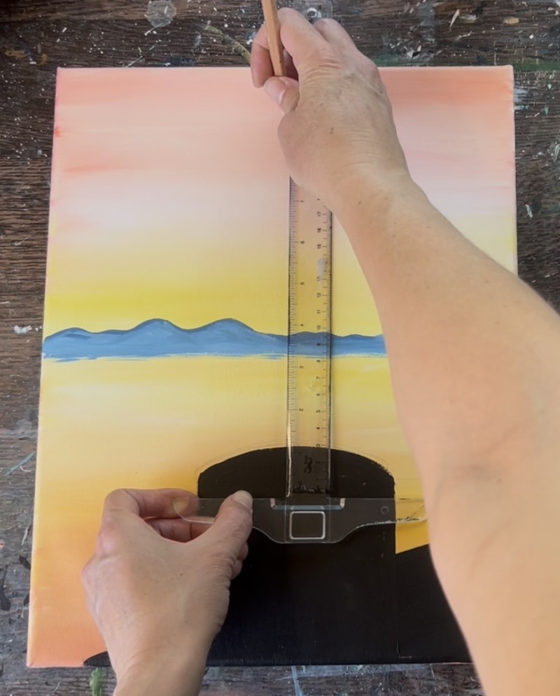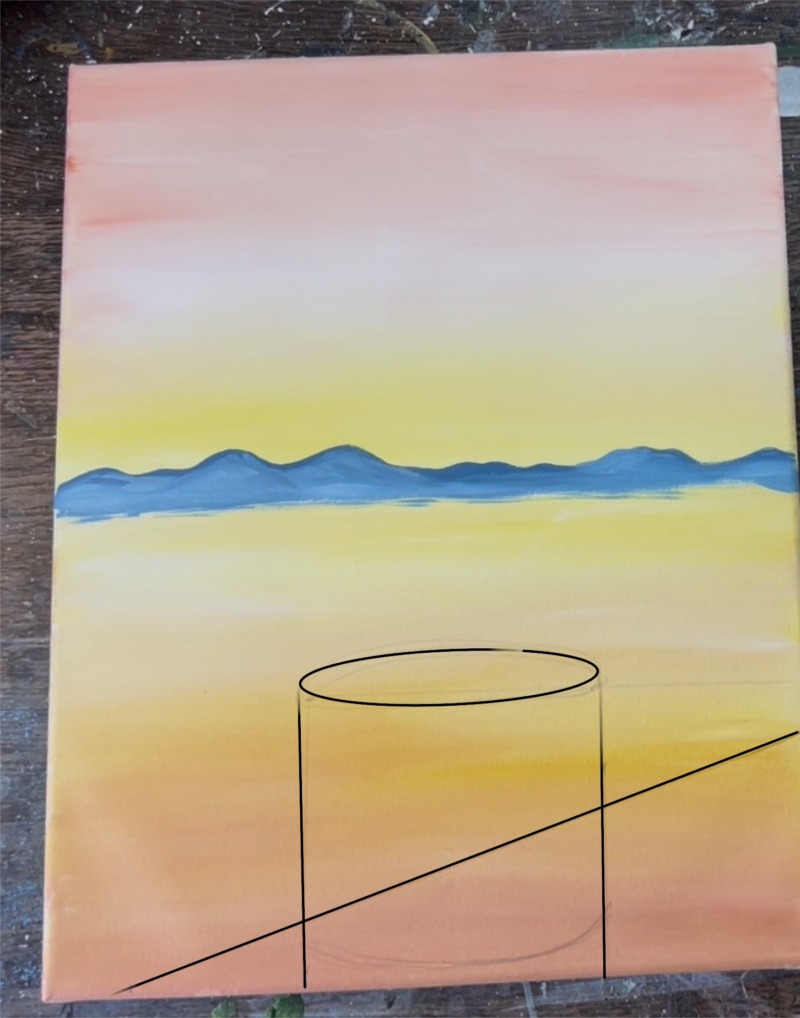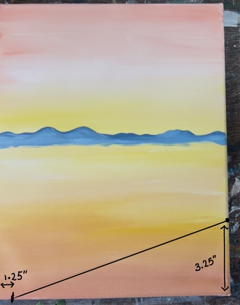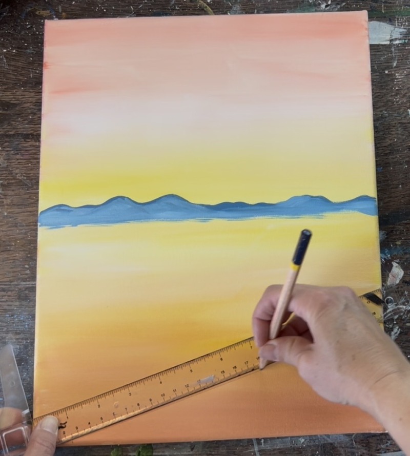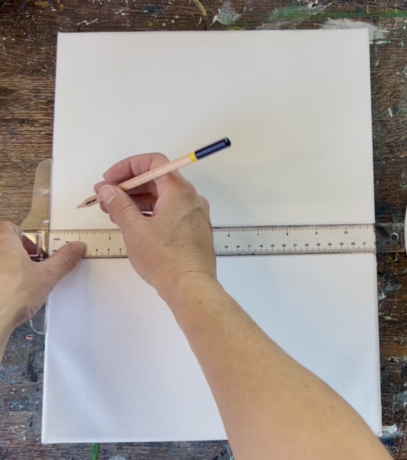 First, place your canvas in a vertical position. Locate the center of the canvas and use a ruler and pencil to draw a horizontal line all the way across the canvas. This will be the “horizon line” in our painting.