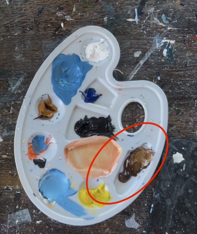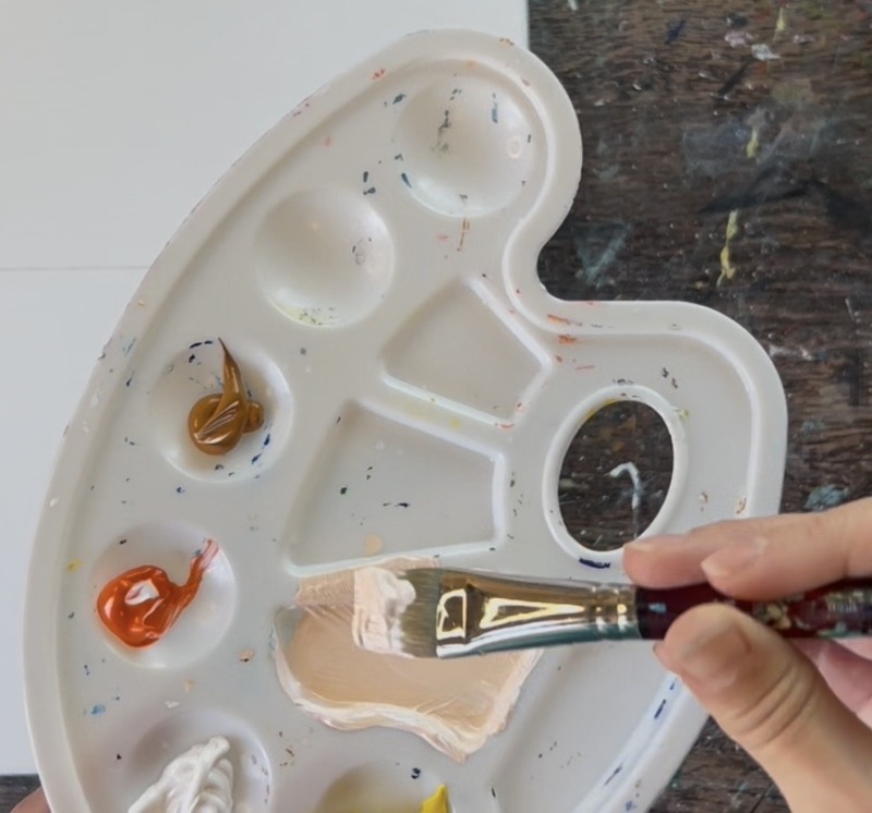 Next, mix a very light orange color on your canvas that is going to resemble a “salmon pink” color! Mix about 3 parts white, 1 part cadmium orange hue and 1 part raw sienna. Yes, “raw sienna” is used in this color to create this pretty pink color!