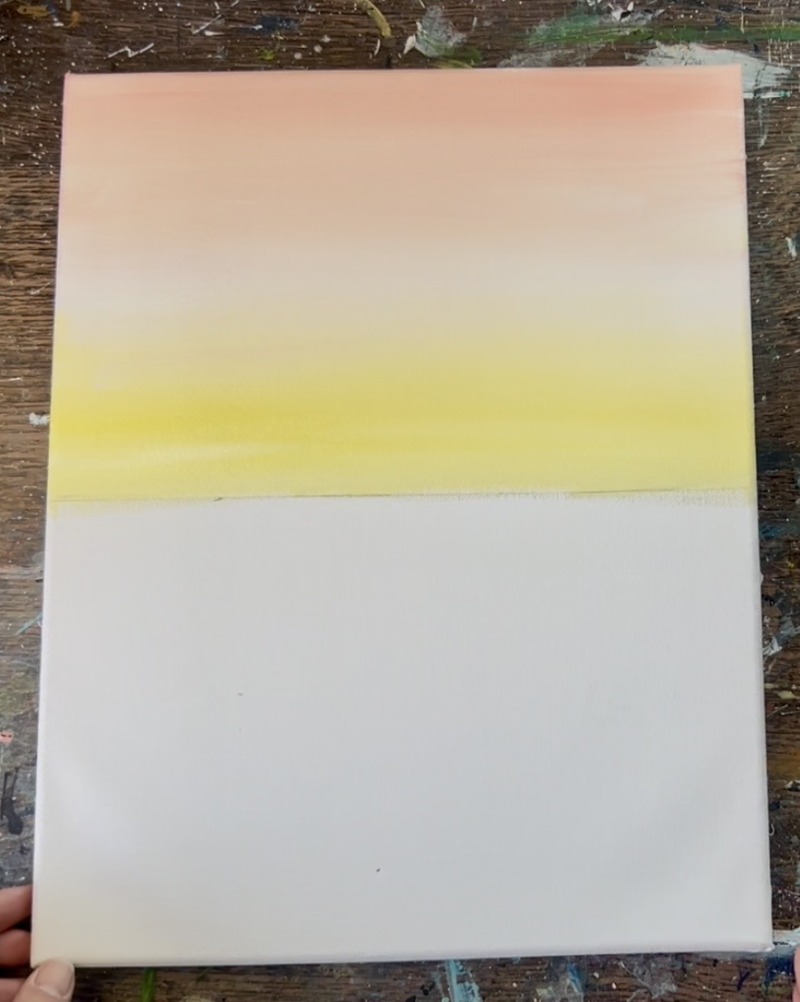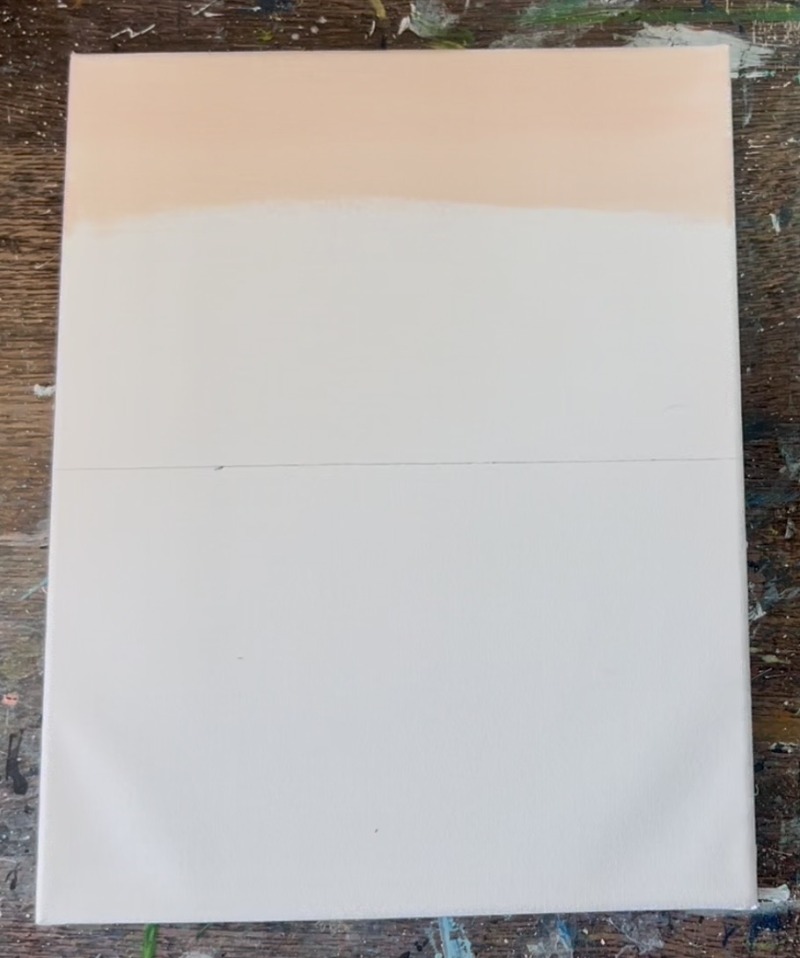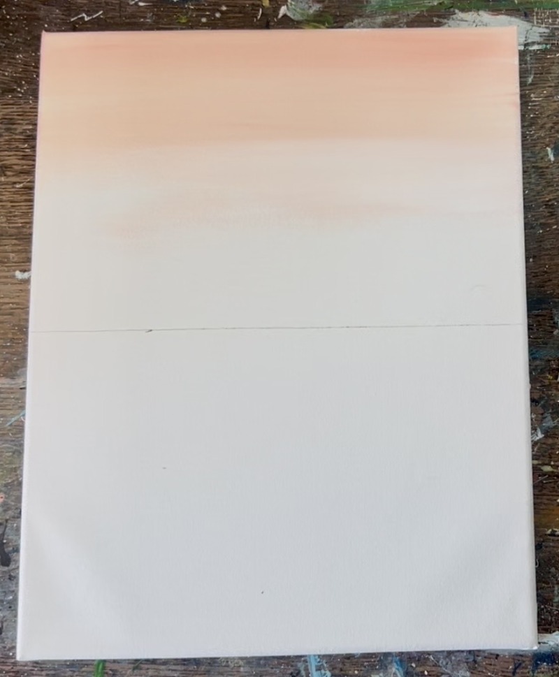 It should be a very light pastel color. The lighter the better! Add more white into the color if needed. Then use the 3/4″ flat wash brush and paint the top third of the canvas with this light pink color-orange color.