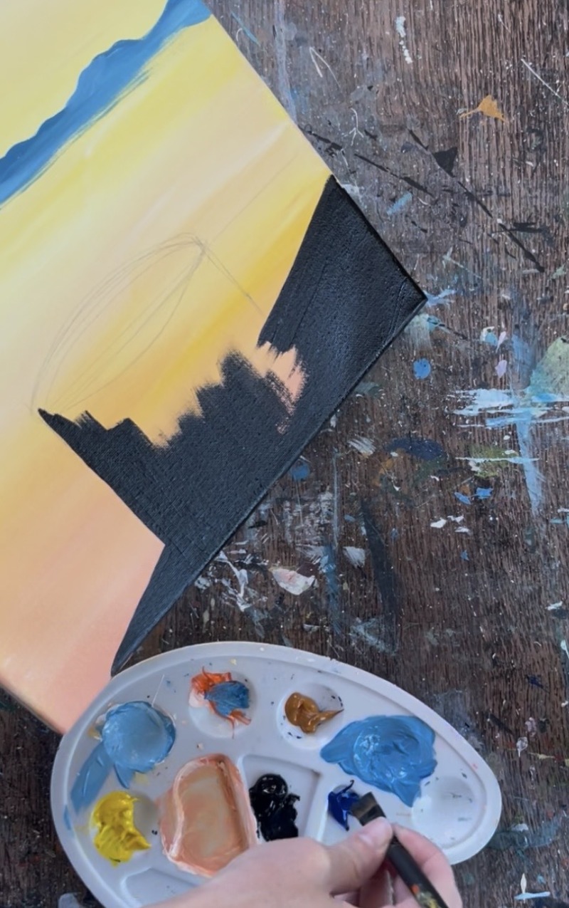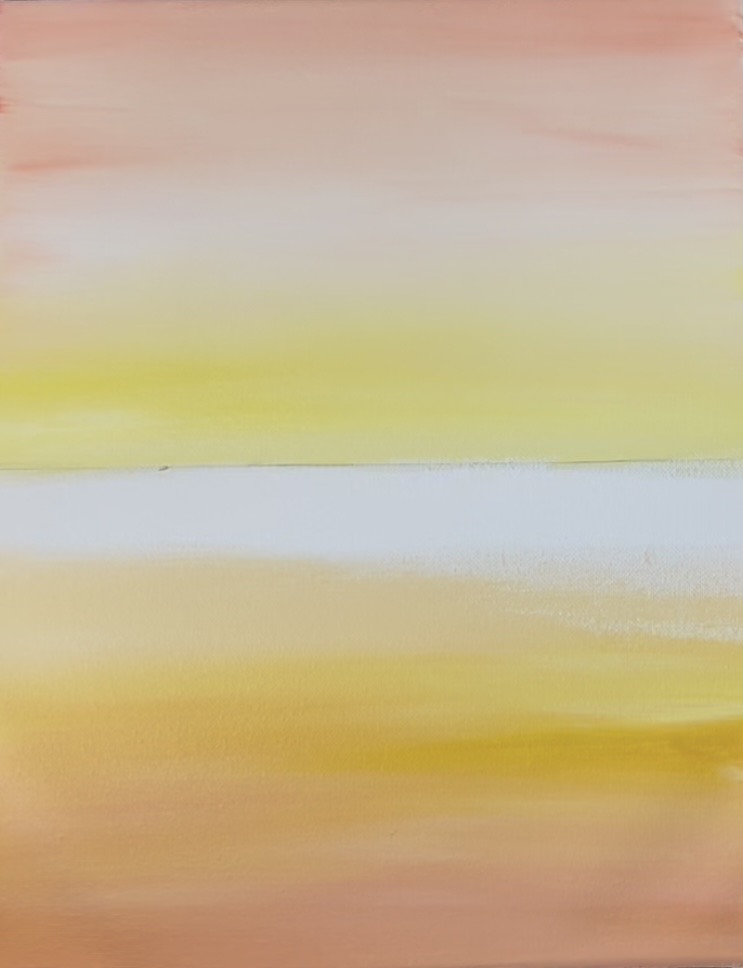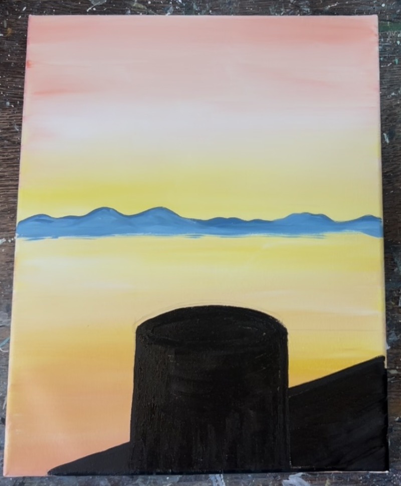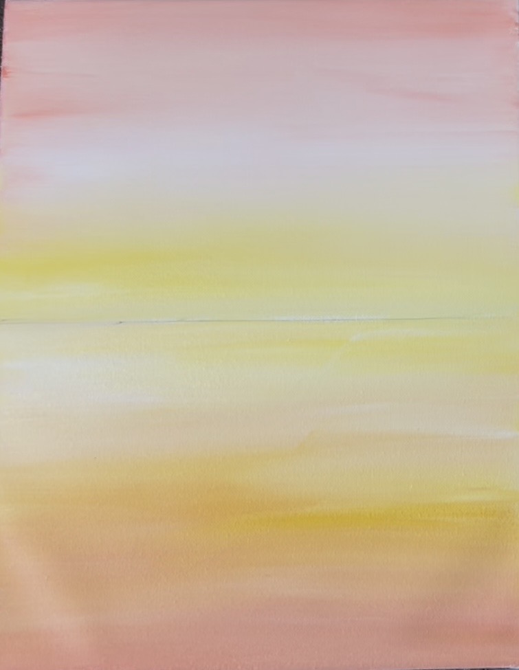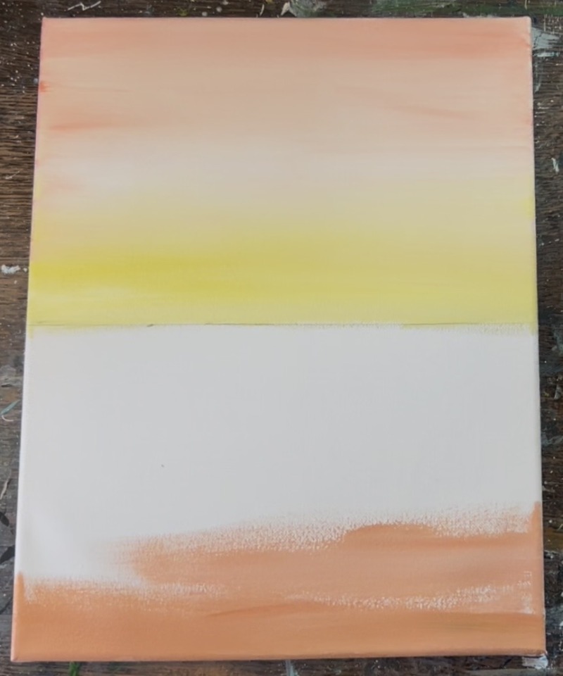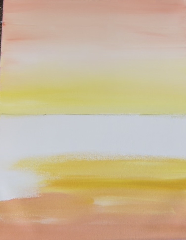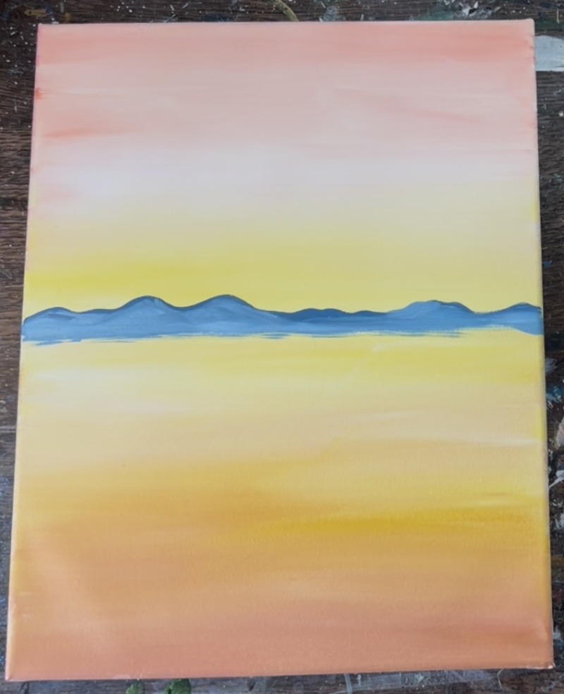 Next, mix yellow and white on your paint palette. Use the 3/4 flat brush to paint the bottom third of the sky with this light yellow color. Blend it up into the middle of the sky. Blend the rest of your sky if needed. I added just a tad bit more orange at the top of the canvas and blended it down just to make the very top of the sky slightly darker.