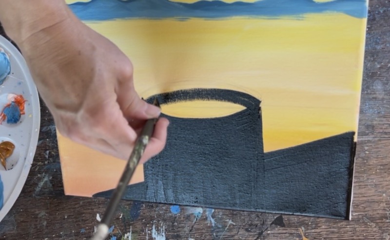 Next, use “mars black” and the #12 bright brush (or 3/4 flat) to paint the dock and the post solid black! Even though you are painting black, make sure the direction of your paint strokes go in the direction that the wood grain will be going. For example, the deck goes diagonal/ parallel to the diagonal line you drew and the post goes vertical (up and down brush strokes).