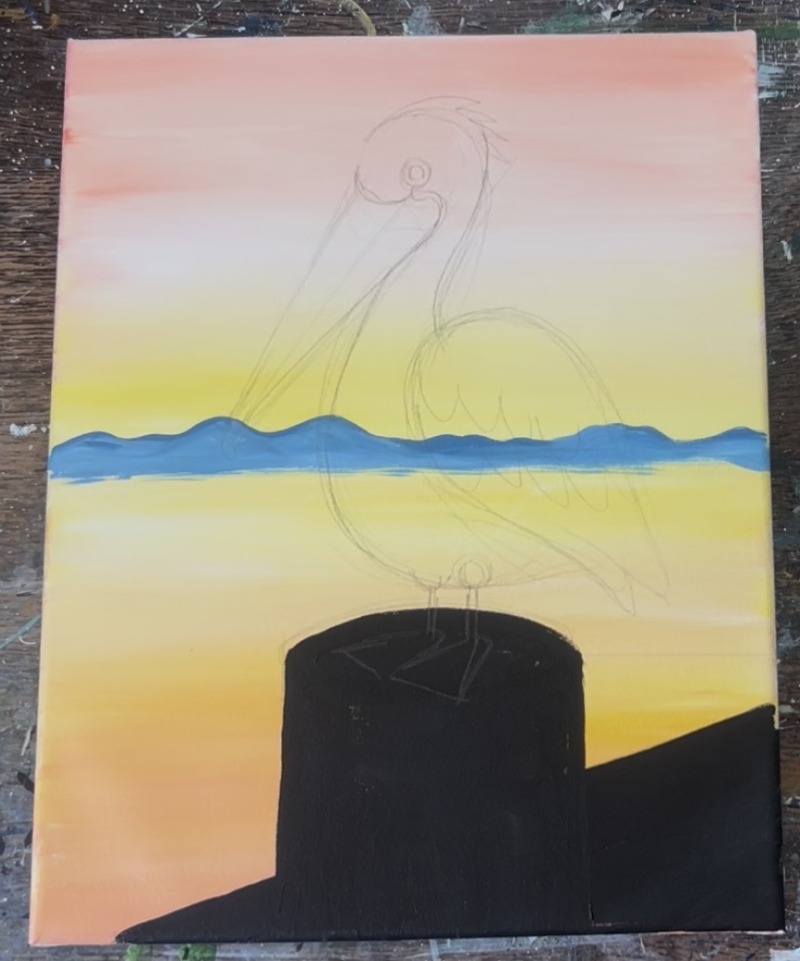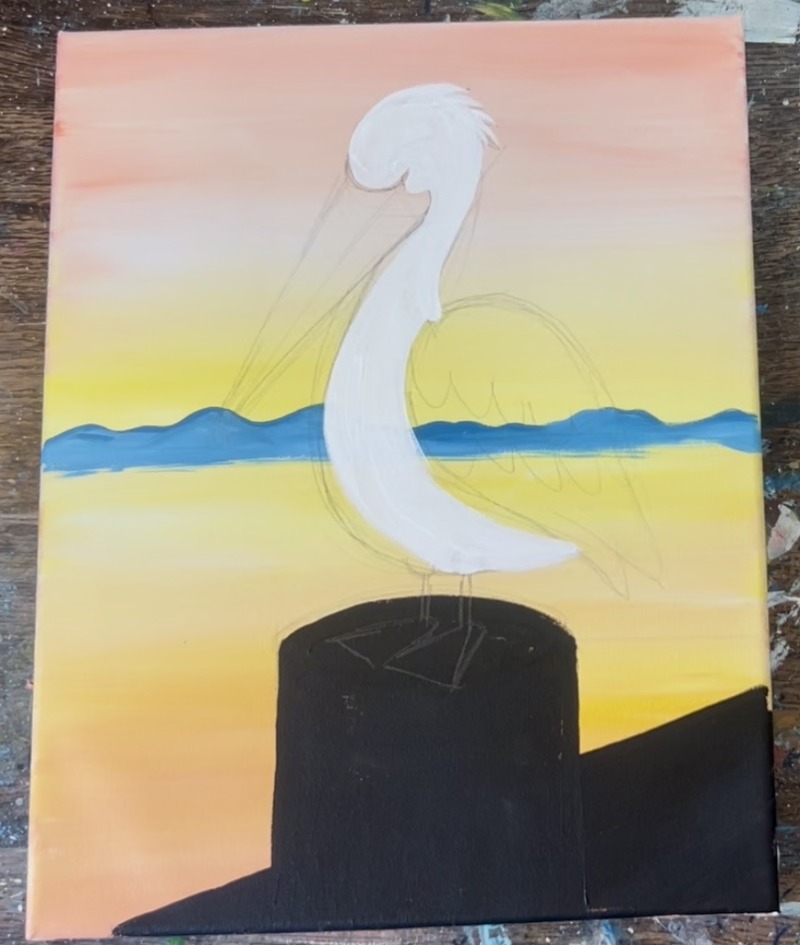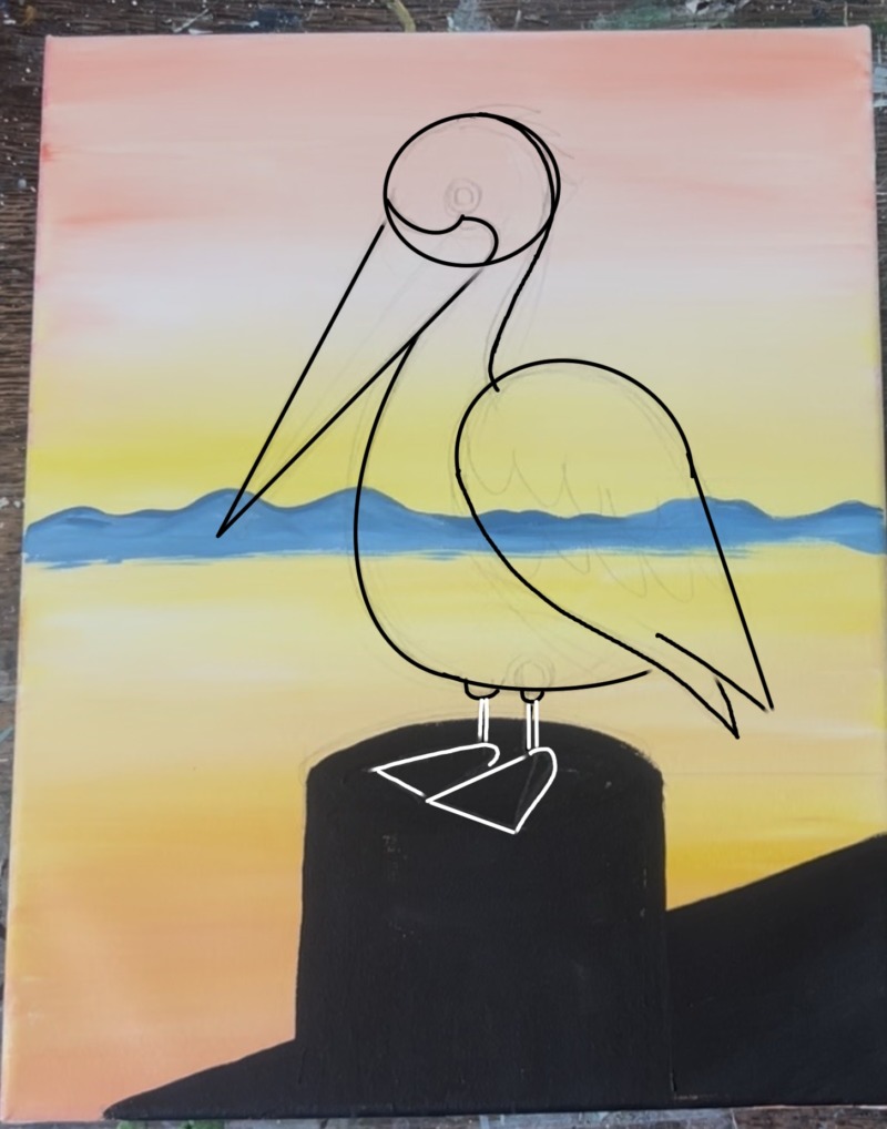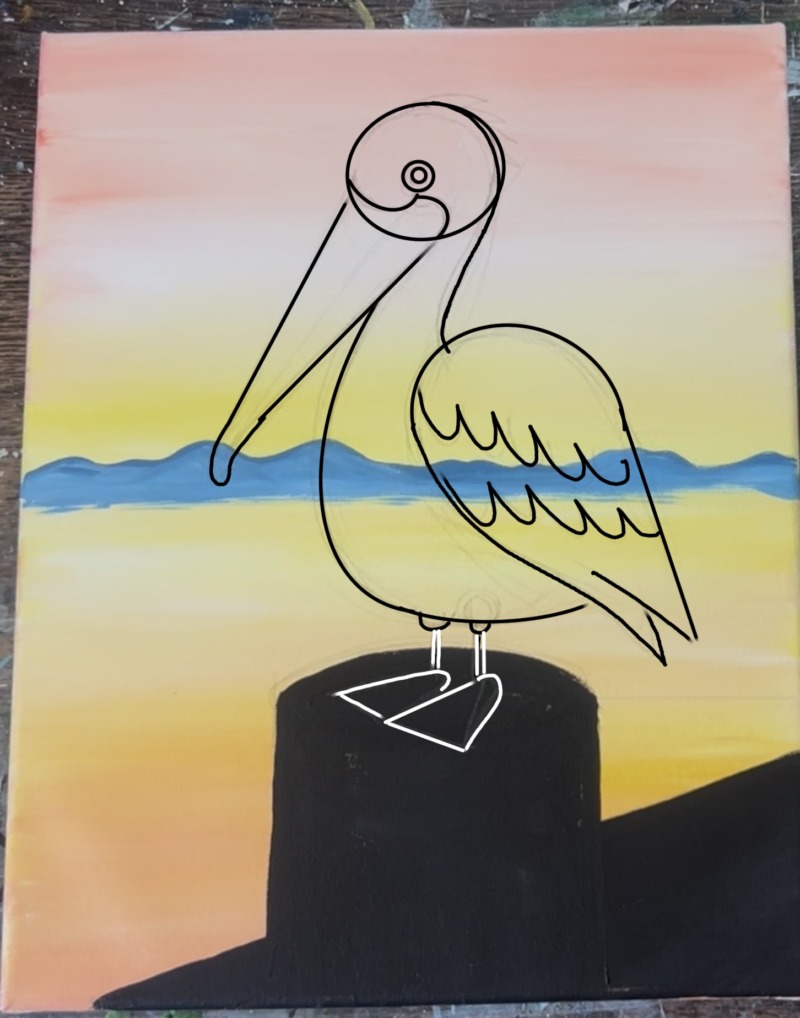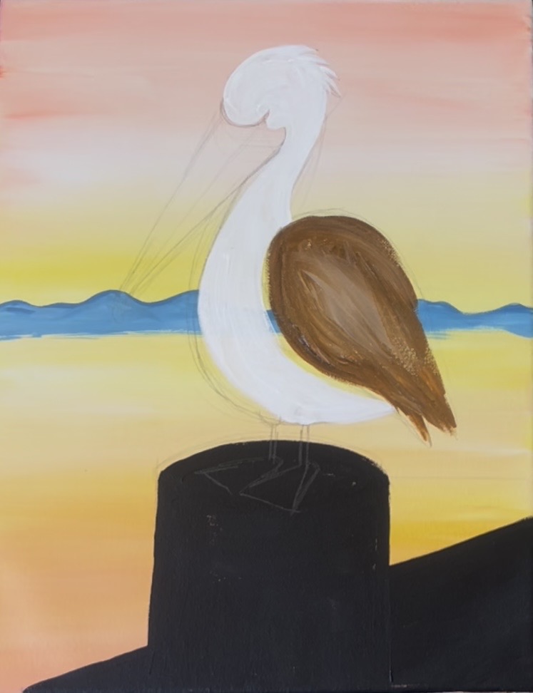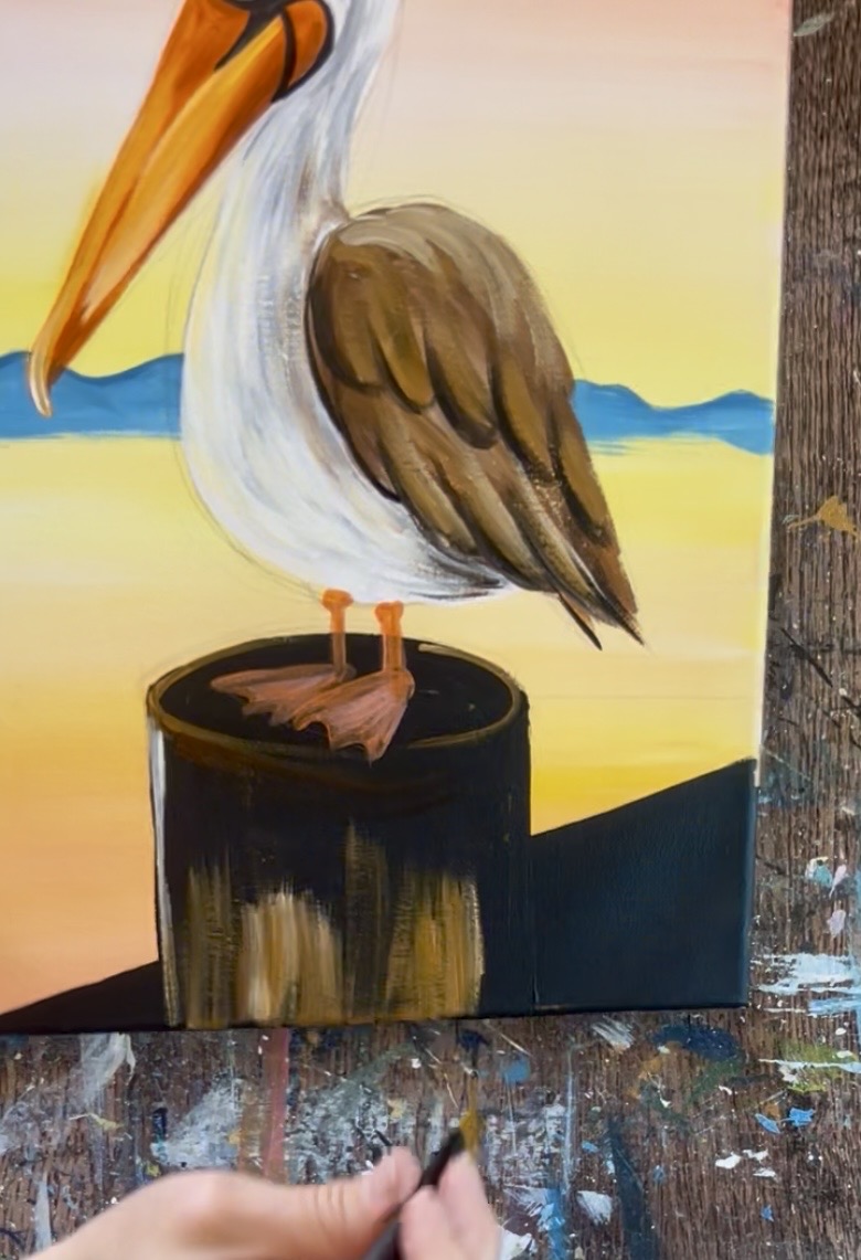 Use a #4 round brush and mix “burnt umber” with a little bit of “titanium white’. Outline the top oval shape of the post around where the pelican’s feet are.