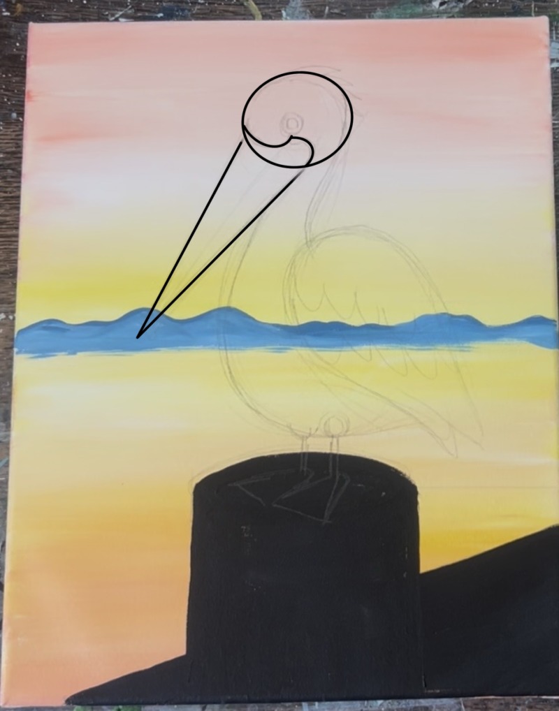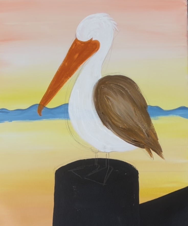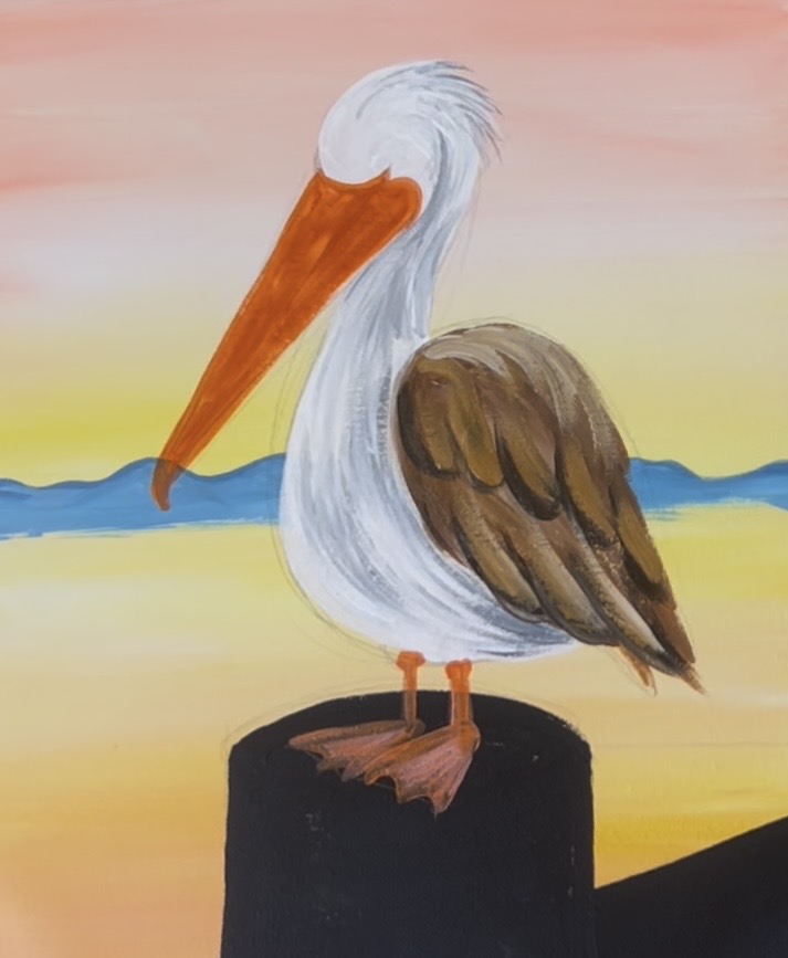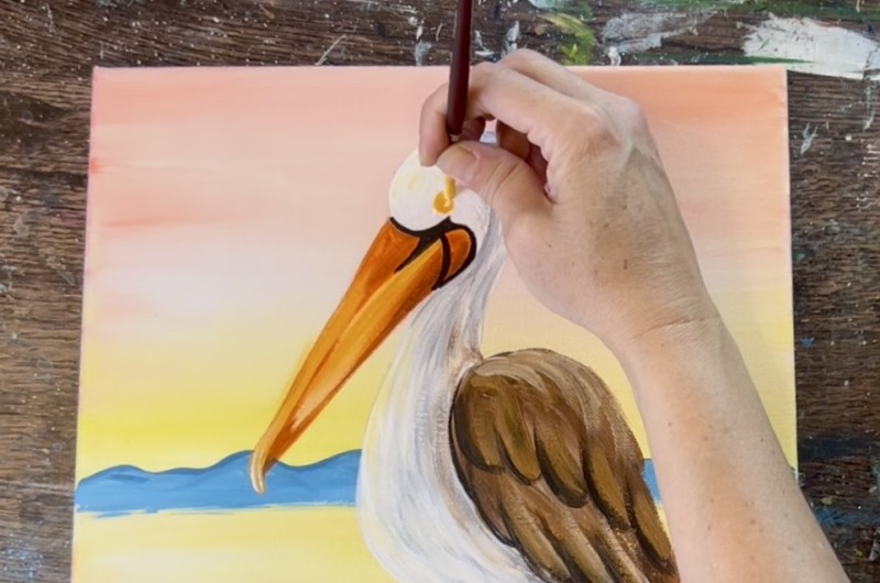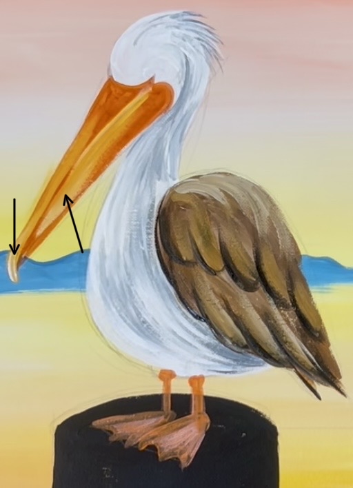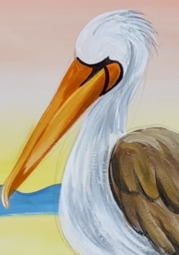 Use the #4 round brush and mix yellow, white and orange together. Paint a small circle just above the black bordering of the beak (in the center of the pelican’s head).