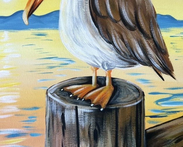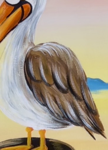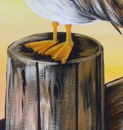 Some final touches for this are: painting little white dots on the “claws” of the pelican. This tiny highlight is enough to get those to stand out much better! Add another slight highlight to the toes/ legs of the pelican with white mixed with a little yellow. Paint a very thin bright colored line along the tree webbed toe lines and on the far left of the legs. Additionally, paint one white/ gray “bump” where the leg on the right meets the body at the top of the leg.
