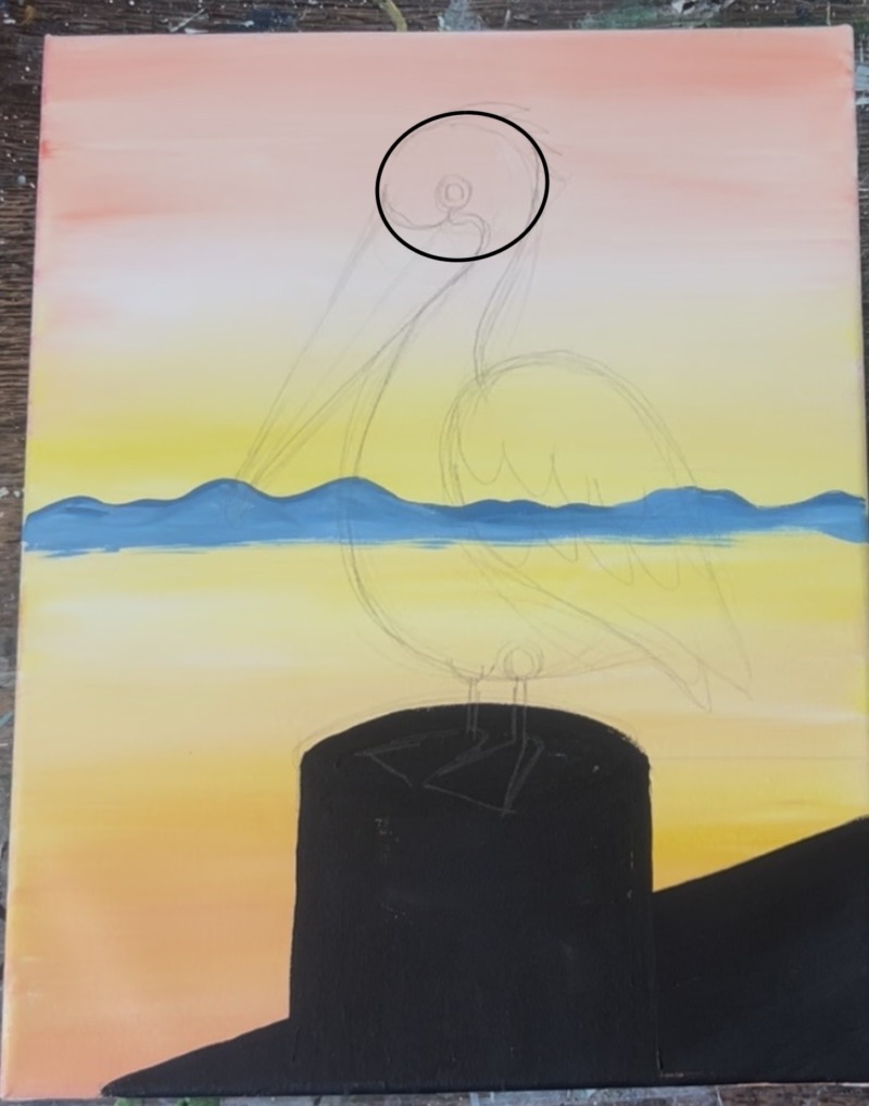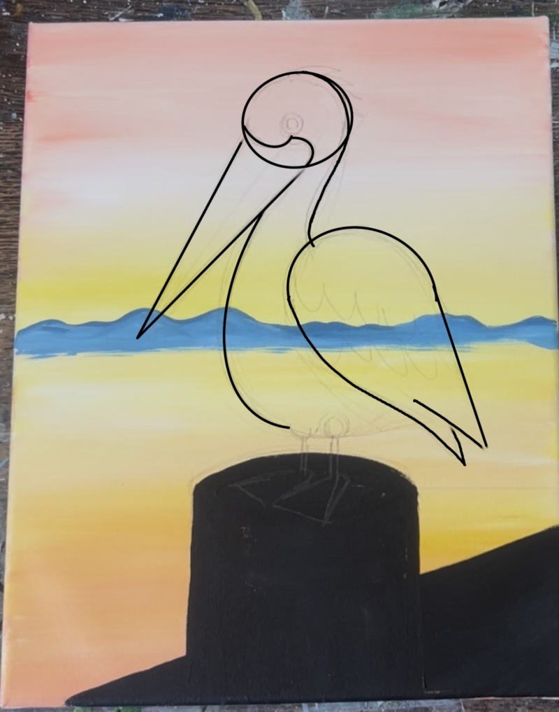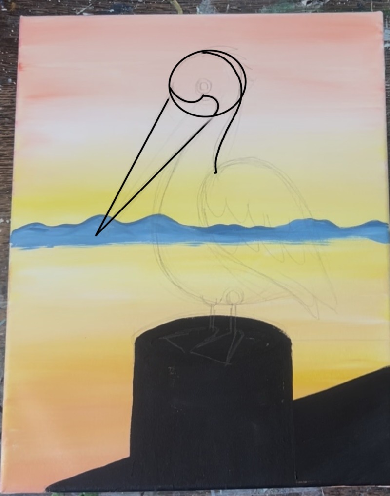 Then sketch the shape of the pelican starting with the head. This is a circle (slightly stretched to technically more of an oval shape). It is about 2″ in diameter and the top edge is at that 9″ mark. Use a pencil to lightly sketch this pelican. The lines in the steps below are darkened so you can see them better.