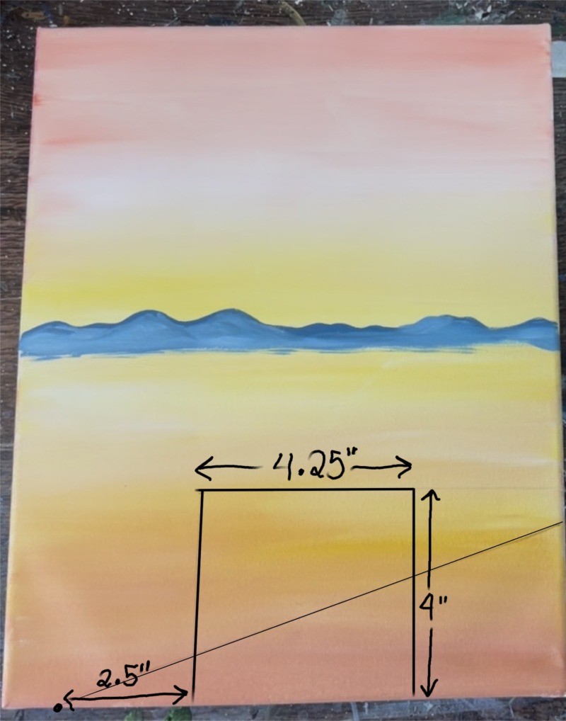 We will be drawing the dock/ post next! You don’t have to use these exact measurement, you can estimate them if you prefer! I first marked 1.25″ on the bottom edge of the canvas. This will be the end of the diagonal line for the edge of the dock. Then on the right edge of the canvas, I measured 3.25″ up from the right edge of the canvas. Connect these two points together to create a diagonal line.