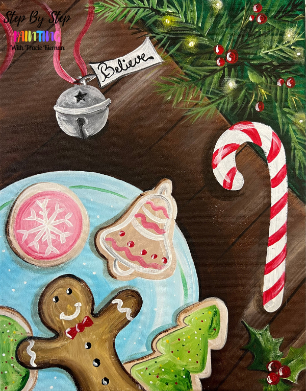 Cookies for Santa is a delightful Christmas painting of a plate of cookies including a charming gingerbread man. This still life scene of a Christmas table also includes candy cane, holly and a believe silver bell from the Polar Express.