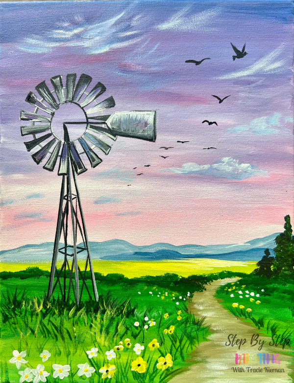 Country Road Dreams is a whimsical country landscape painting with windmill, flying birds and dirt road path. Paint little wildflowers and cypress trees in the distance. Join now to get access to this painting and any of the other bonus tutorials. Plans start at $10 monthly and you can cancel anytime.